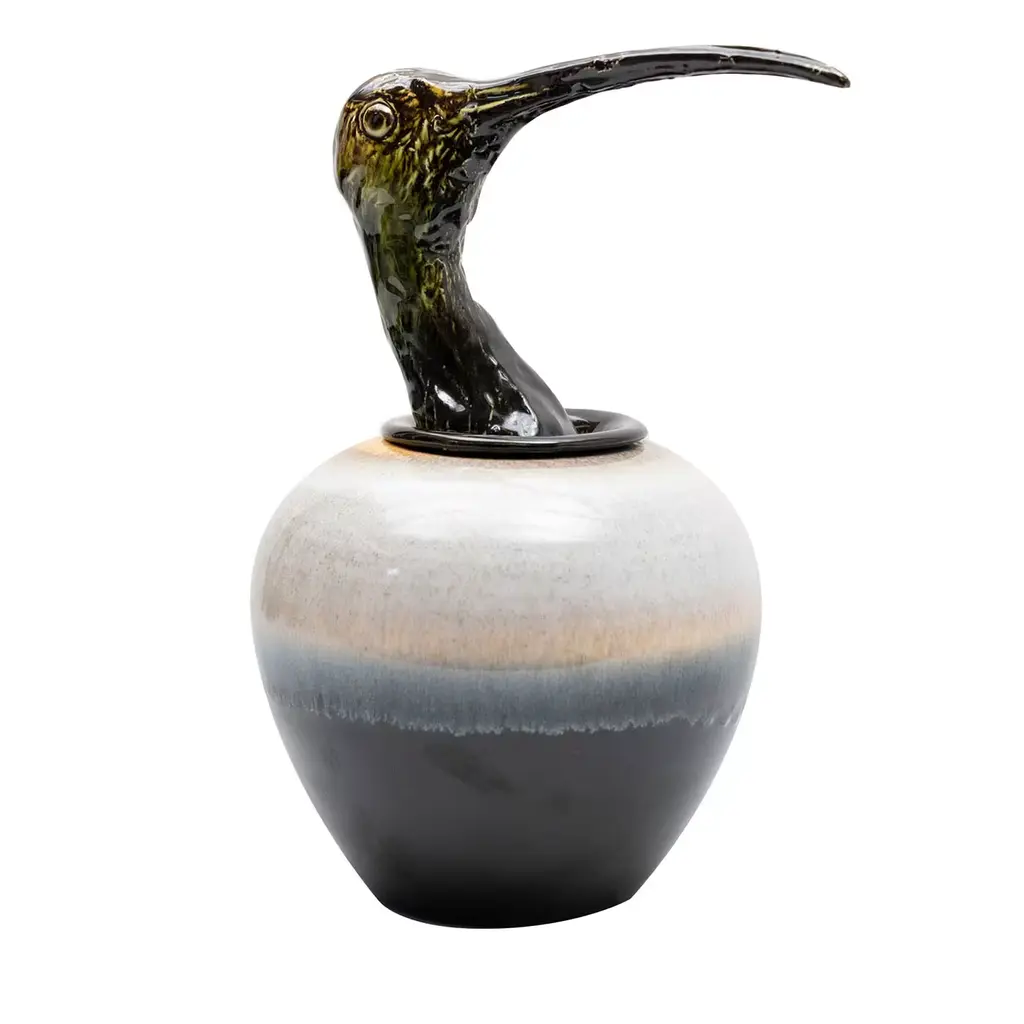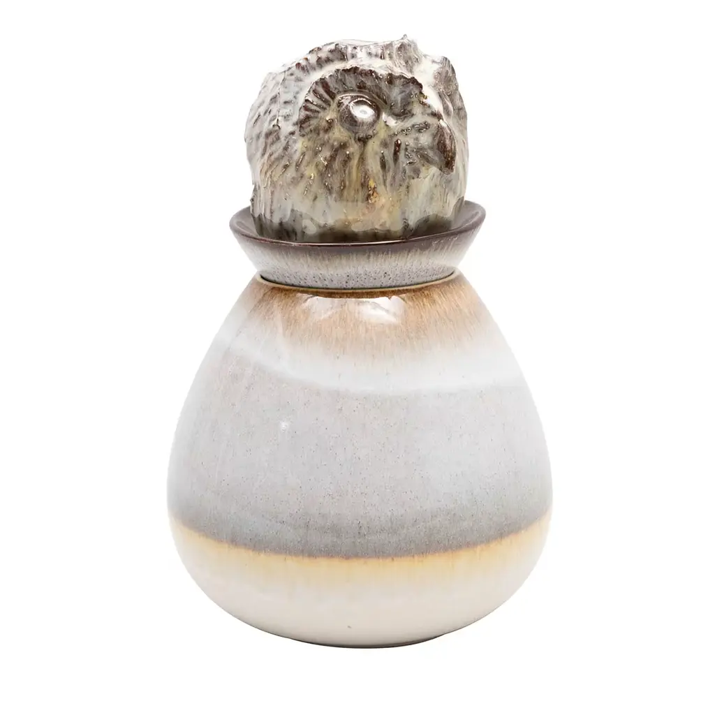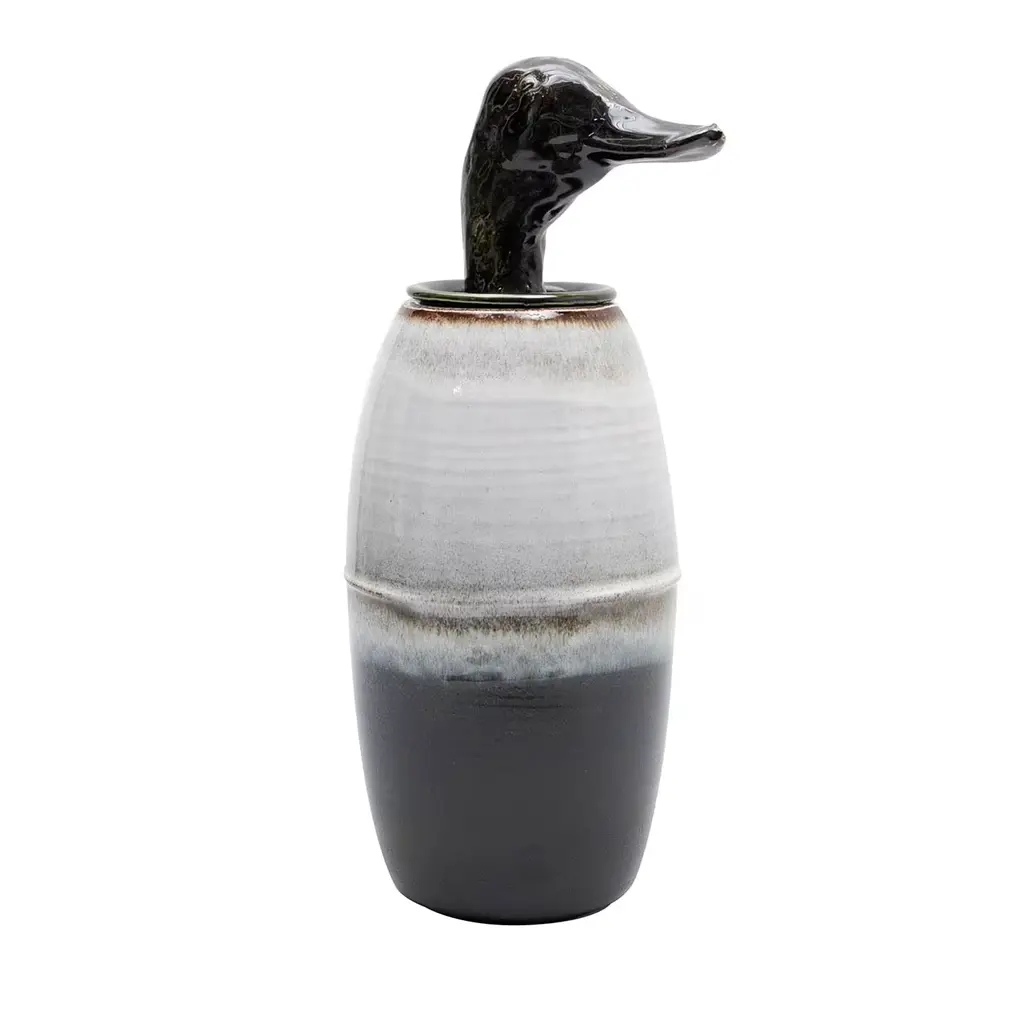 This vase is directly inspired by Egyptian canopic jars; it is an ironic and contemporary reinterpretation of an ancestral object, a tutelary deity of domestic tranquility. A creature with a magical aura, endowed mostly with positive connotations, the rooster is an animal that brings light, cheerfulness, and the ferrying man out of the nightmares of the night. Handcrafted and glazed with oxides and crystallines, the work becomes a unique, precious, and sculptural object.