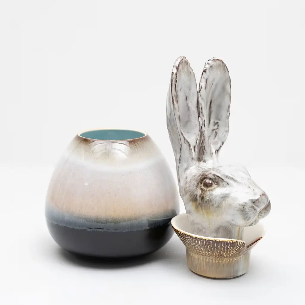 This vase is directly inspired by the Egyptian canopic jars; it is an ironic and contemporary reinterpretation of an ancestral object, the tutelary deity of domestic quiet. The rabbit is in fact a symbol of abundance, prosperity, and longevity and more simply a beautiful animal. Made by hand and enameled with oxides and crystallines, the work becomes a precious and sculptural object.