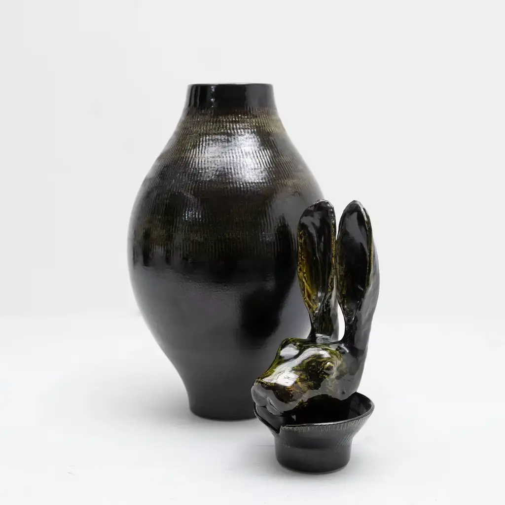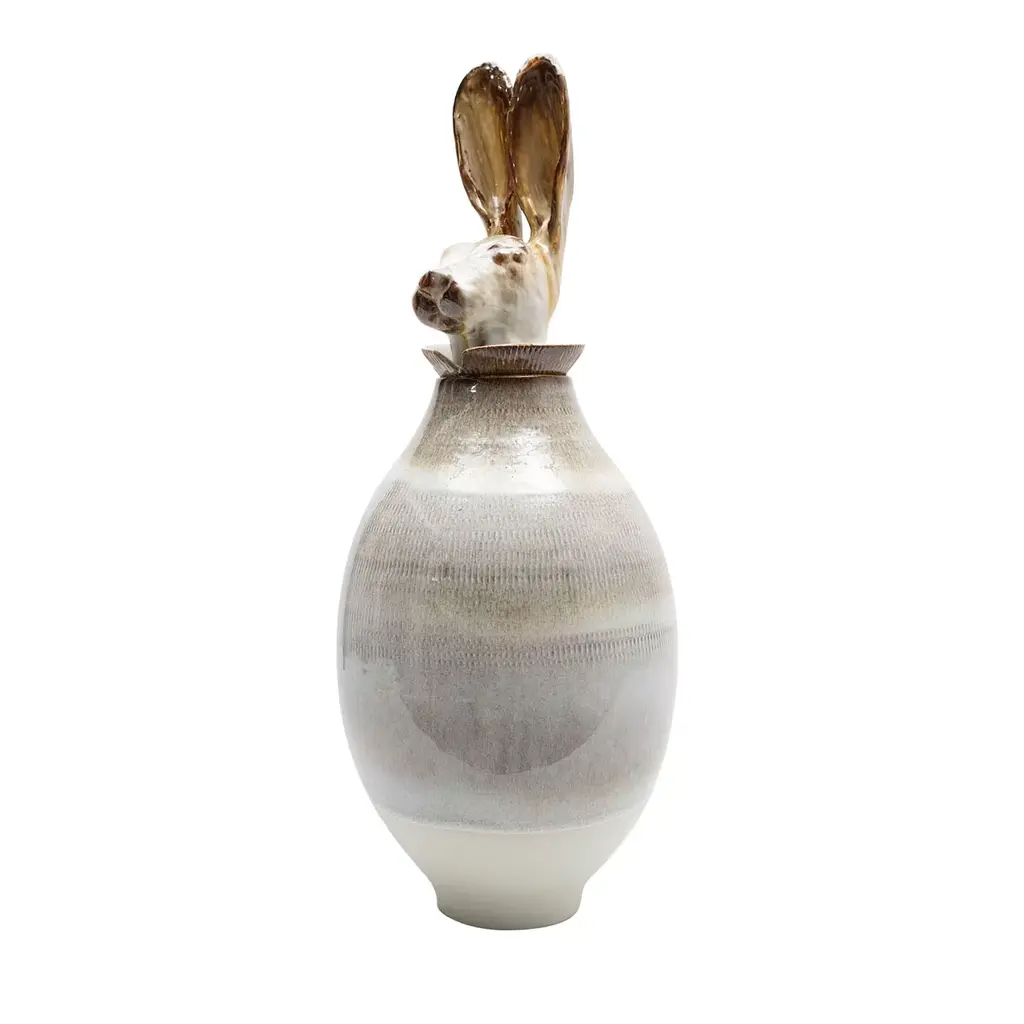 This vase is directly inspired by the Egyptian canopic jars; it is an ironic and contemporary reinterpretation of an ancestral object, the tutelary deity of domestic quiet. The rabbit is in fact a symbol of abundance, prosperity, and longevity and more simply a beautiful animal. Made by hand and enameled with oxides and crystallines, the work becomes a precious and sculptural object.