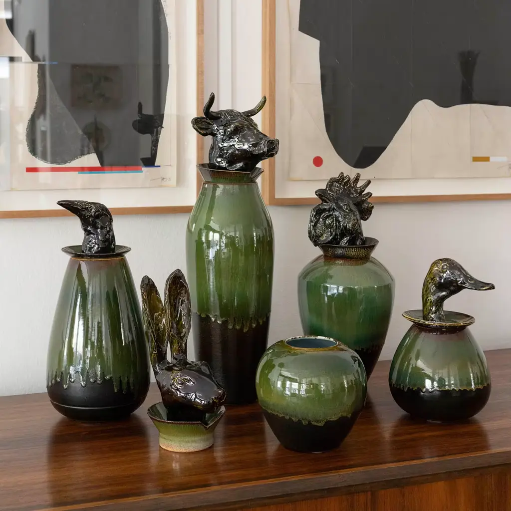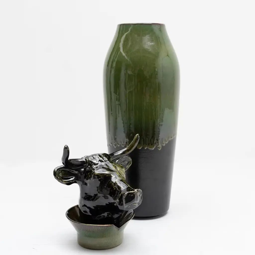 This vase is directly inspired by Egyptian canopic jars; it is an ironic and contemporary reinterpretation of an ancestral object, the tutelary deity of domestic tranquility. Powerful, fertile, regal, and divine: a true force of nature worshipped by man since antiquity, the bull is a generator of positive energy. Handcrafted and glazed with oxides and crystallines, the work becomes a unique, precious, and sculptural object.