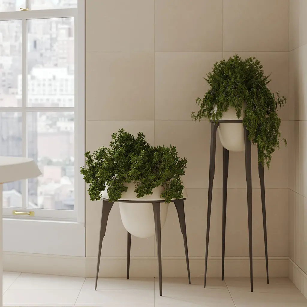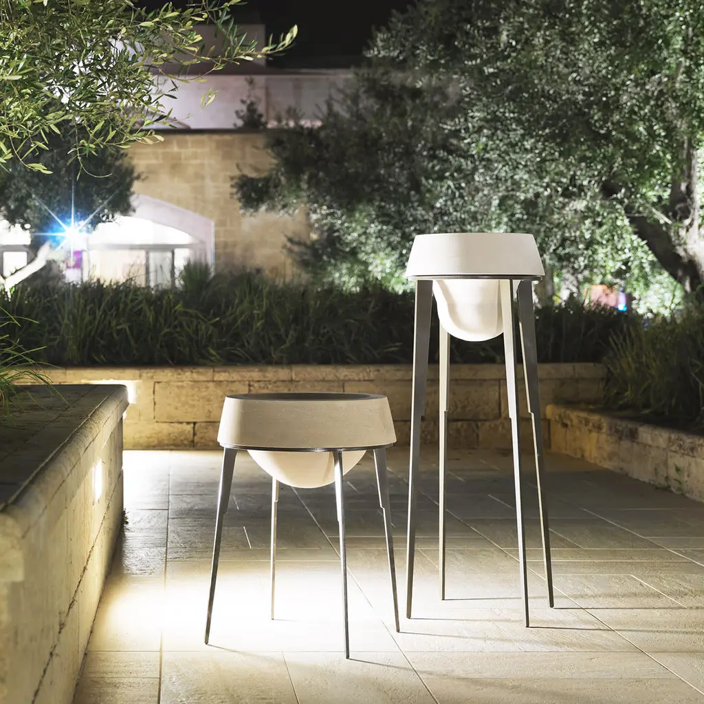 Part of an elegant series that also includes a lower, larger version and a brazier, this vase by Silvio De Ponte immediately captures the eye with its slender silhouette. Clean geometric profiles outline the naturally bright Lecce limestone vase, which is slotted in a four-legged iron base, lending the whole piece its distinctive visual impact. A larger low version is also available in the Artemest catalog.
