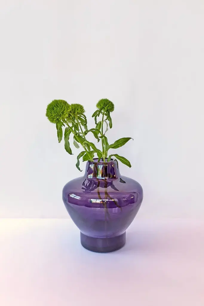 CAPRI is a blown glass vase.It is a combination of two vases, that can serve both as a sculpural crystal piece and a flower vase. The gently flattened upper surface of the rounded top transforms it into a natural vase, perfect for creating an ideal flower arrangement. A crystal piece artfully created with the traditional hand - blowing technique. The pureness of the crystal reflects the light illuminating the interior which is placed in. Variations in color or in small details are the result of the craftsmanship of this article and make each piece unique.Featureshand-blown and shaped in Italycolor: purplematerial: pure lead crystal glass