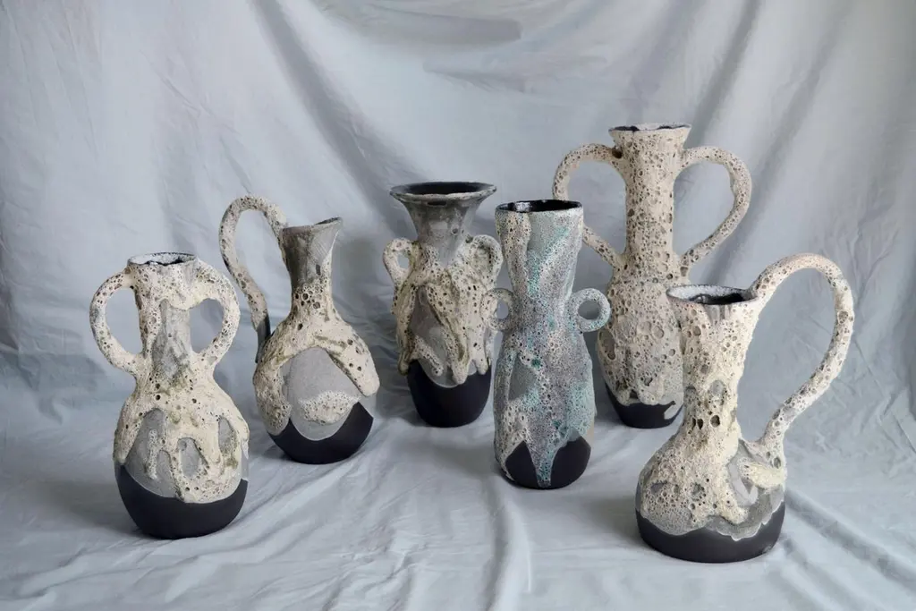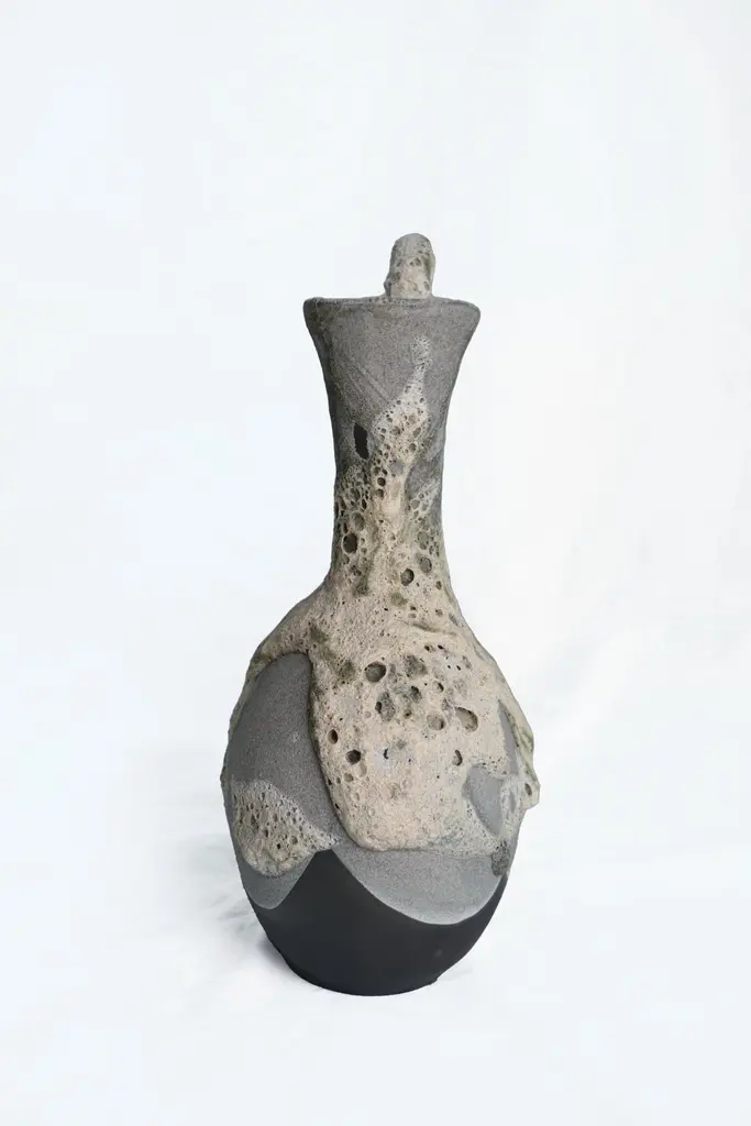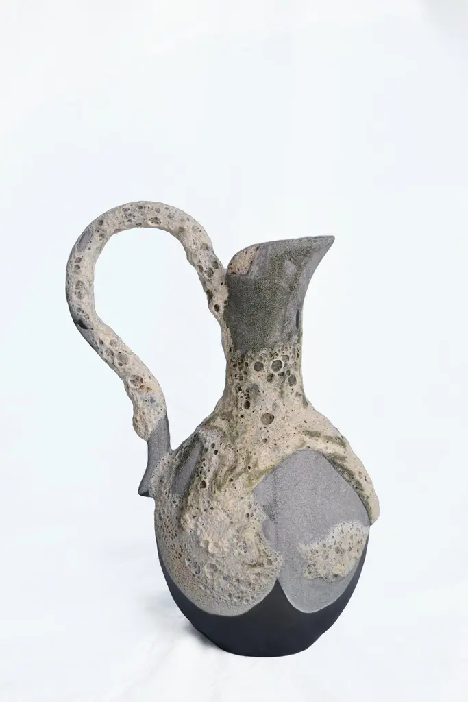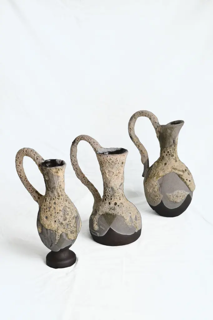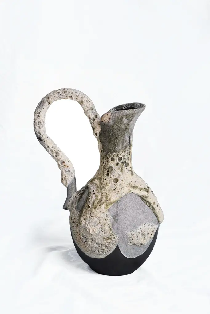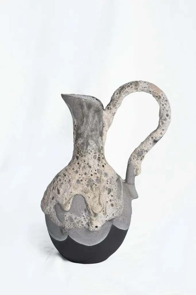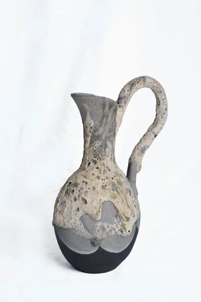 Carafe 2 vase by Anna KarountzouDimensions: W 21 x D 14 x H 34 cmMaterials: black stoneware clay, clear glaze inside, handmade crater glaze outside, fired at 1220Born and based in Athens, Greece, with a background in conservation of works of art and antiquities, her work is inspired by ancient civilizations and natural settings.Anna started creating ceramics in 2014 after graduating. Conservation has been a strong influence since the beginning. Her way of working was guided by absolute discipline, concentration, attention to detail, patience and dedication. The background knowledge in the science of materials worked as a tools in understanding how to create her own glazes.With focus on vessels that provoke an earthy feeling, combining the ancient with the contemporary. Using materials found in places she feels connected with, her work captivates memories.Ceramics functional and sculptural, all formed by traditional hand- building techniques such as the coiling and pinching method. Unique and one of a kind pieces, slowly made by hand. All pots have been fired at a high temperature to ensure their durability.“At first, I worked on perfecting my coiling method and achieving the ideal symmetry to a flawless piece. After years of exploring and practicing my craft I found what expresses me truly as an artist and a person.I often feel like each piece guides me and I follow its lead. I like to create a family of ceramics since I feel each piece is unique but together they create a wholesome feeling of peace. I opt to use materials and glazes to decorate my ceramics on earthy tones. I'm inspired by nature and I'm obsessed with the marks of time. I seek out the nostalgia of the old and one of the ways I express that is the essence of corrosion my pieces have.”.