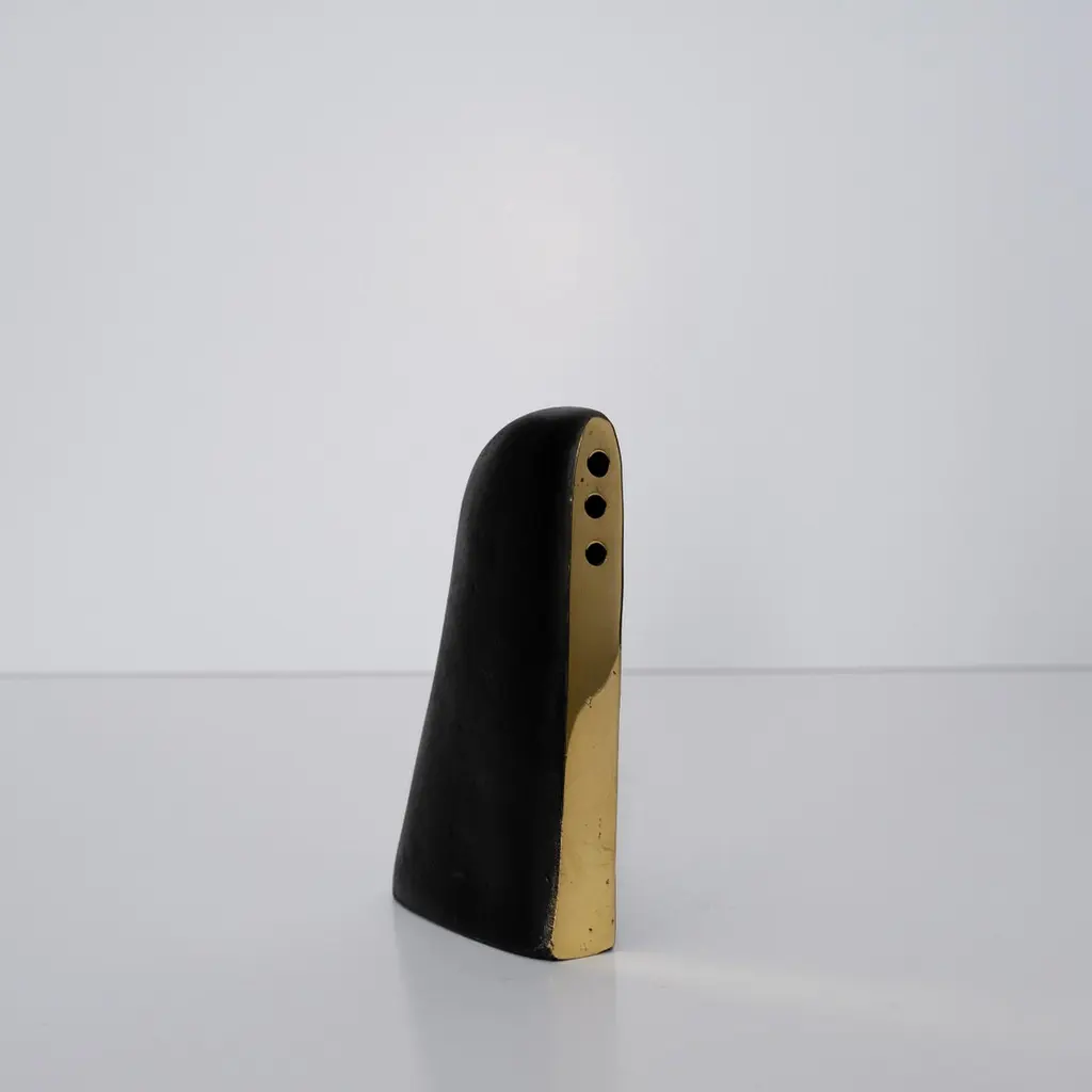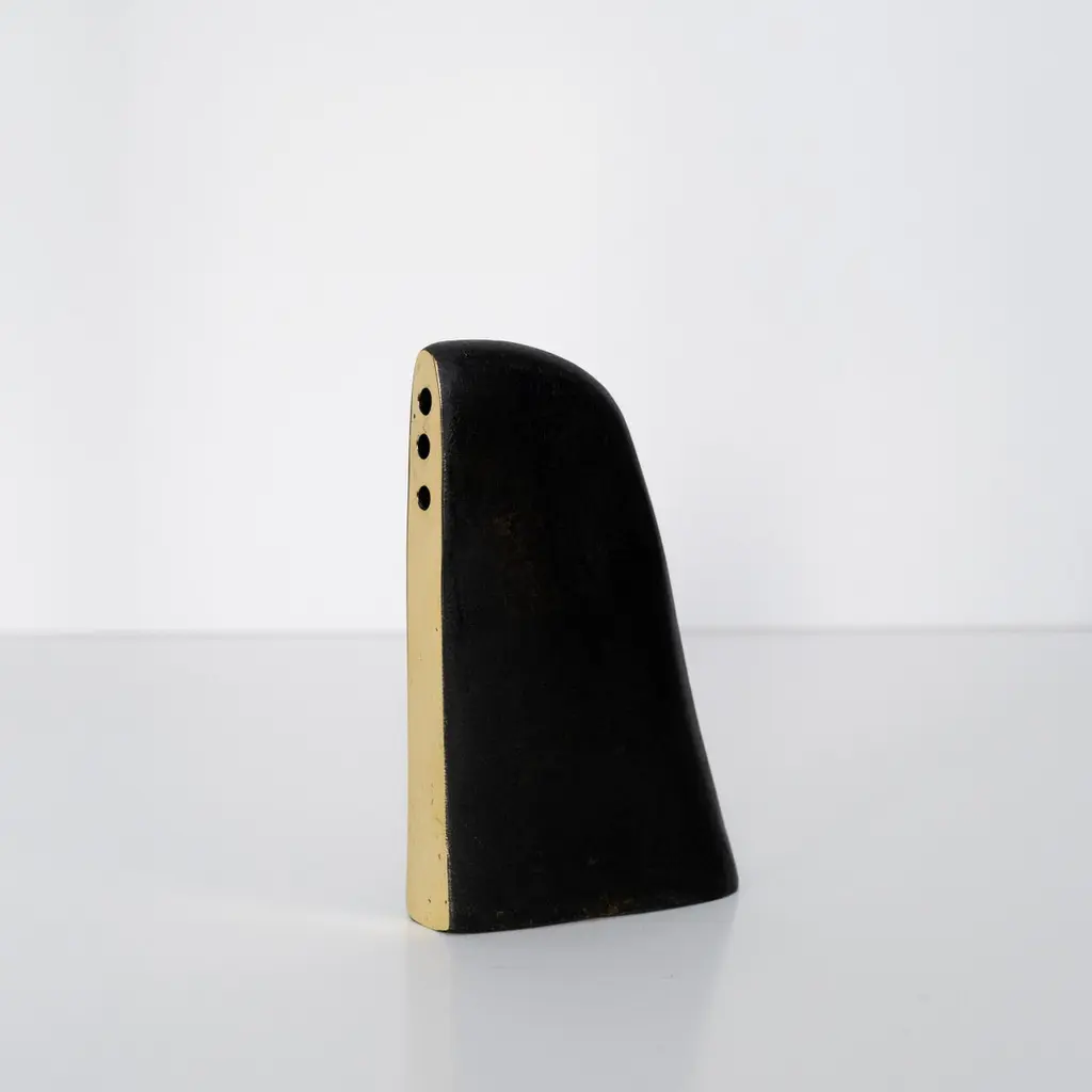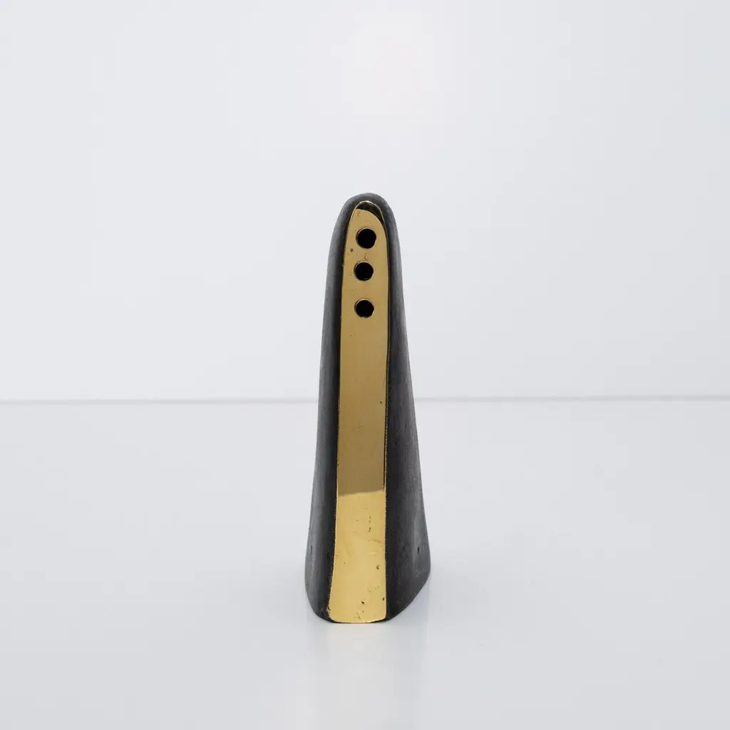 Carl Auböck model #3786 'Alert' patinated brass vase. Designed in the 1950s, this incredibly refined and sculptural 3-hole vase features the iconic Auböck patination with a polished brass accent. Three holes provide options for arranging flowers.Produced by Carl Auböck IV in the original Auböck Werkstätte in the 7th district of Vienna using the same exacting standards, high-quality materials, original molds and techniques of his legendary grandfather. Auböck's design career was long and varied, reaching its pinnacle of prestige at the Triennale di Milano in 1954, where he received four gold medals in recognition of his iconic work.Price is per item. Available in unlimited quantities. One in stock and ready to ship. Out of stock lead time 2-3 weeks or more. Inventory availability subject to change without notice.Please note that only one representative example of each item is shown in the images. Finish varies from item to item due to the handmade nature of their fabrication and due to the unique chemical patination process, which is meant to simulate 80-100 years of exposure of brass to sunlight.Made to order. All sales are final.