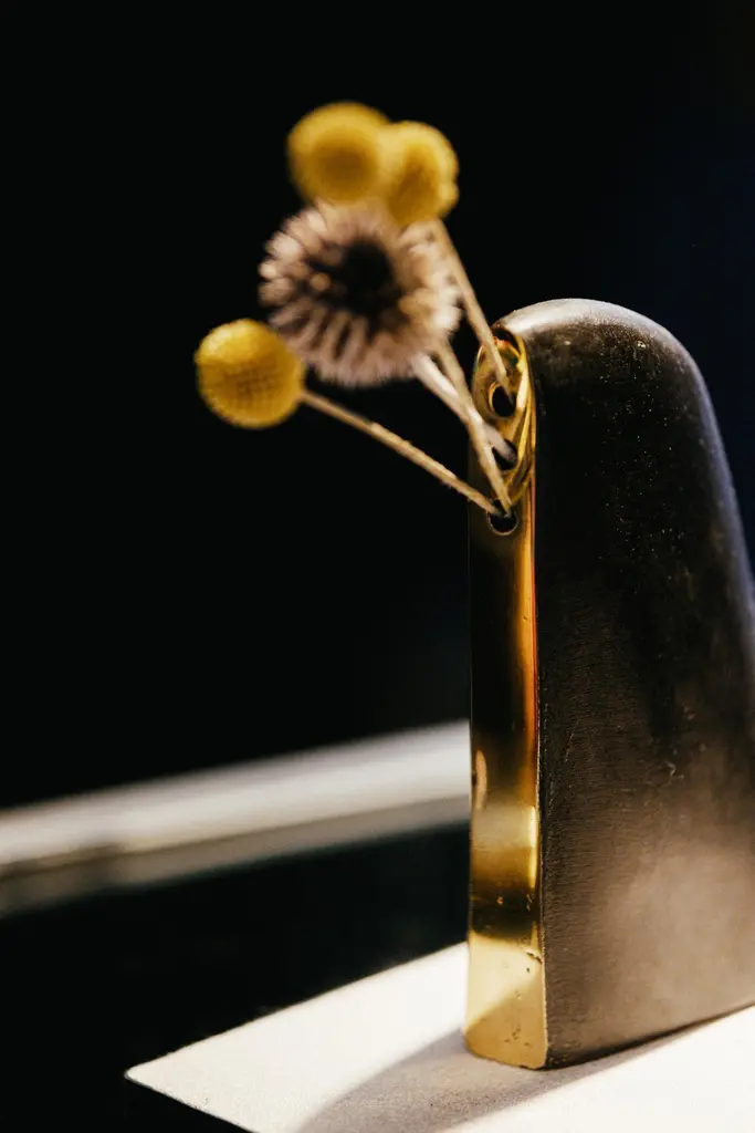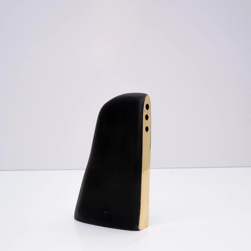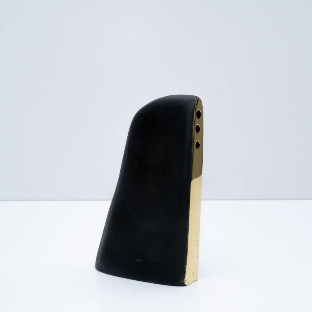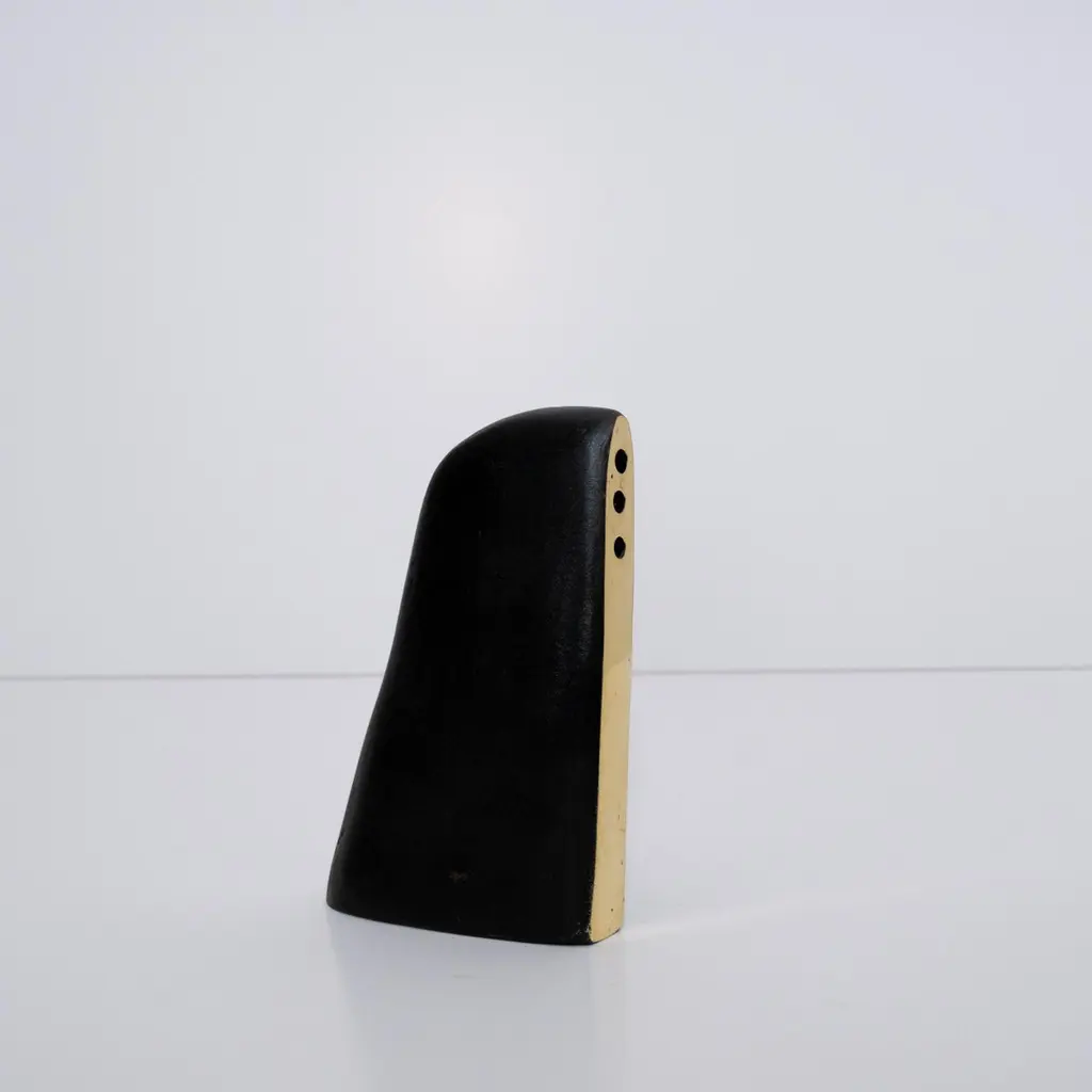 Carl Auböck model #3786 'Alert' patinated brass vase. Designed in the 1950s, this incredibly refined and sculptural 3-hole vase features the iconic Auböck patination with a polished brass accent. Three holes provide options for arranging flowers.Produced by Carl Auböck IV in the original Auböck Werkstätte in the 7th district of Vienna using the same exacting standards, high-quality materials, original molds and techniques of his legendary grandfather. Auböck's design career was long and varied, reaching its pinnacle of prestige at the Triennale di Milano in 1954, where he received four gold medals in recognition of his iconic work.Price is per item. Available in unlimited quantities. One in stock and ready to ship. Out of stock lead time 2-3 weeks or more. Inventory availability subject to change without notice.Please note that only one representative example of each item is shown in the images. Finish varies from item to item due to the handmade nature of their fabrication and due to the unique chemical patination process, which is meant to simulate 80-100 years of exposure of brass to sunlight.Made to order. All sales are final.
