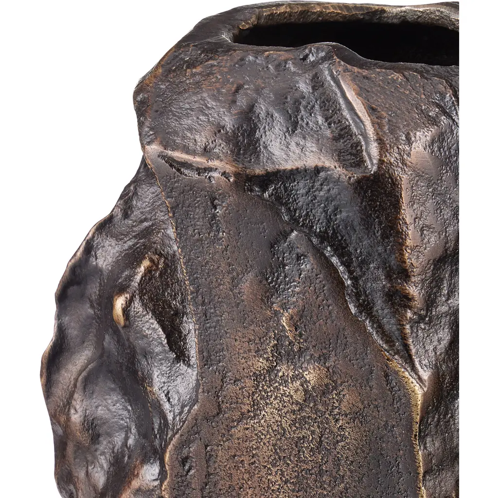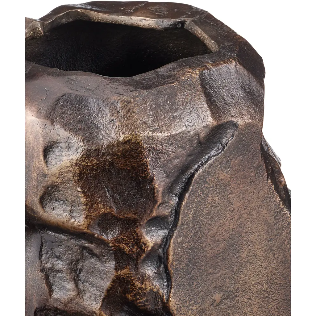 Brutalist in style, the Carmelo Vase Set includes two cast aluminum vessels in a scorched bronze finish that brings the surfaces a warm gleam. The organically shaped profiles look as if they were born during the famous time in design history when brutalism was at its height. Made in two parts and joined with a welding process, these vases are designed for use only with artificial flowers.