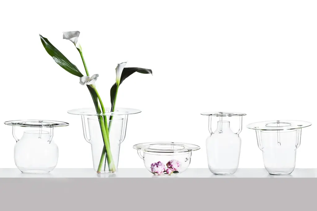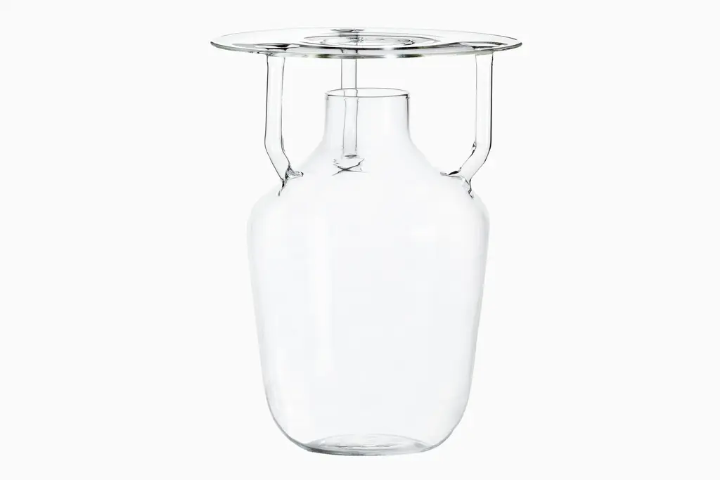 Launched in 2012 by Romes renowned gallery Secondome,The Carry Artids collection features striking hand-blown glass vessels from the legendarily unorthodox starchitect Nigel Coates. Long a devotee of classical themes, Coates drew inspiration from caryatids sculpted female figures used as support pillars in ancient Greek architecture. Coates infuses each piece from the series, like this charming Bucket Vase, with subtle human qualities: feminine, curvy bodies with arms stretched overhead supporting glass discs. Signed by Maker
