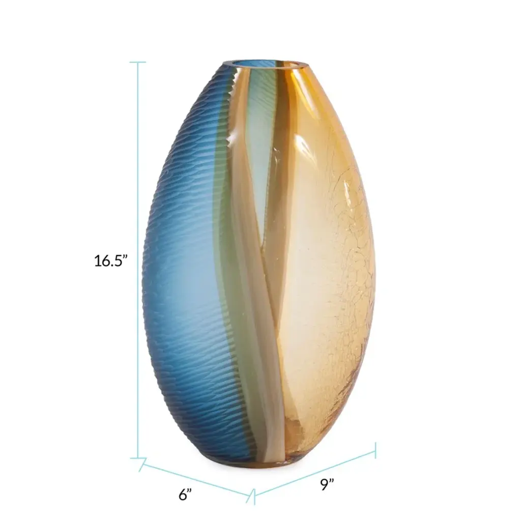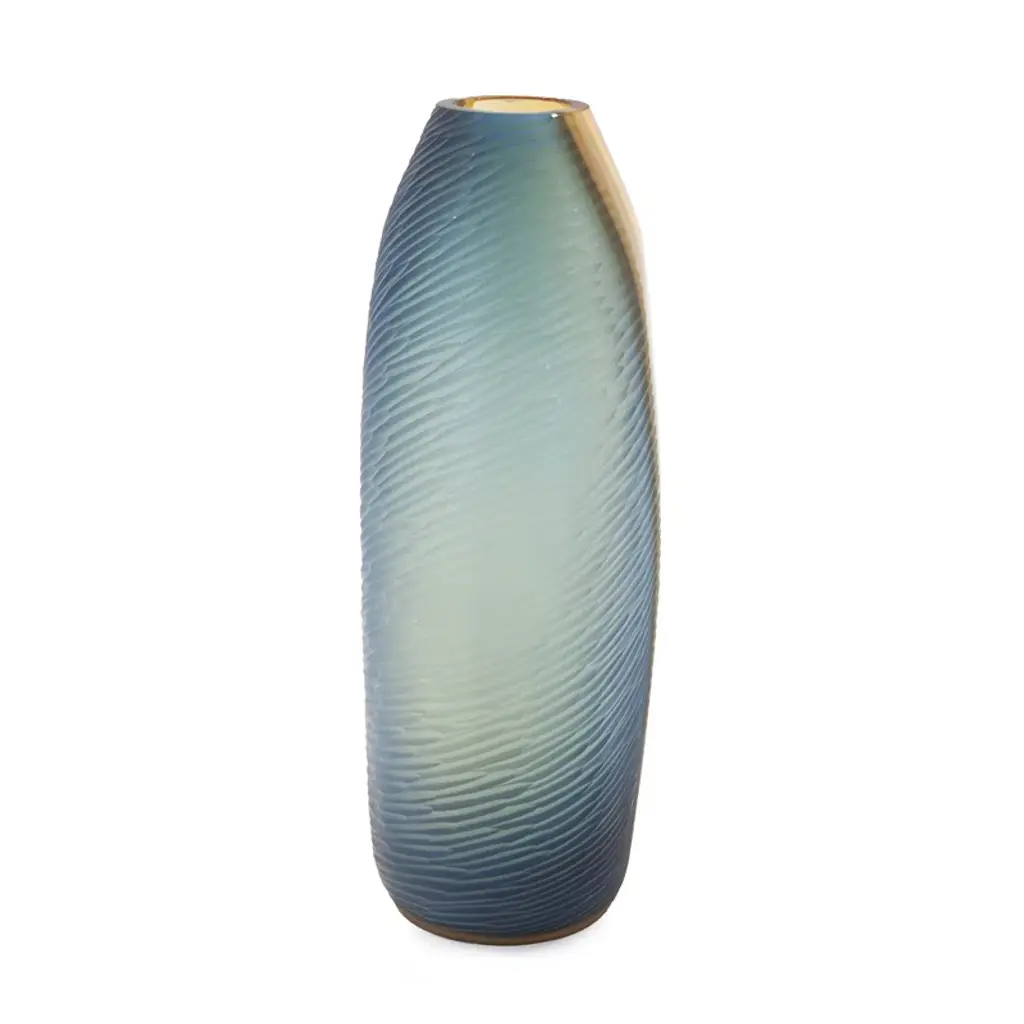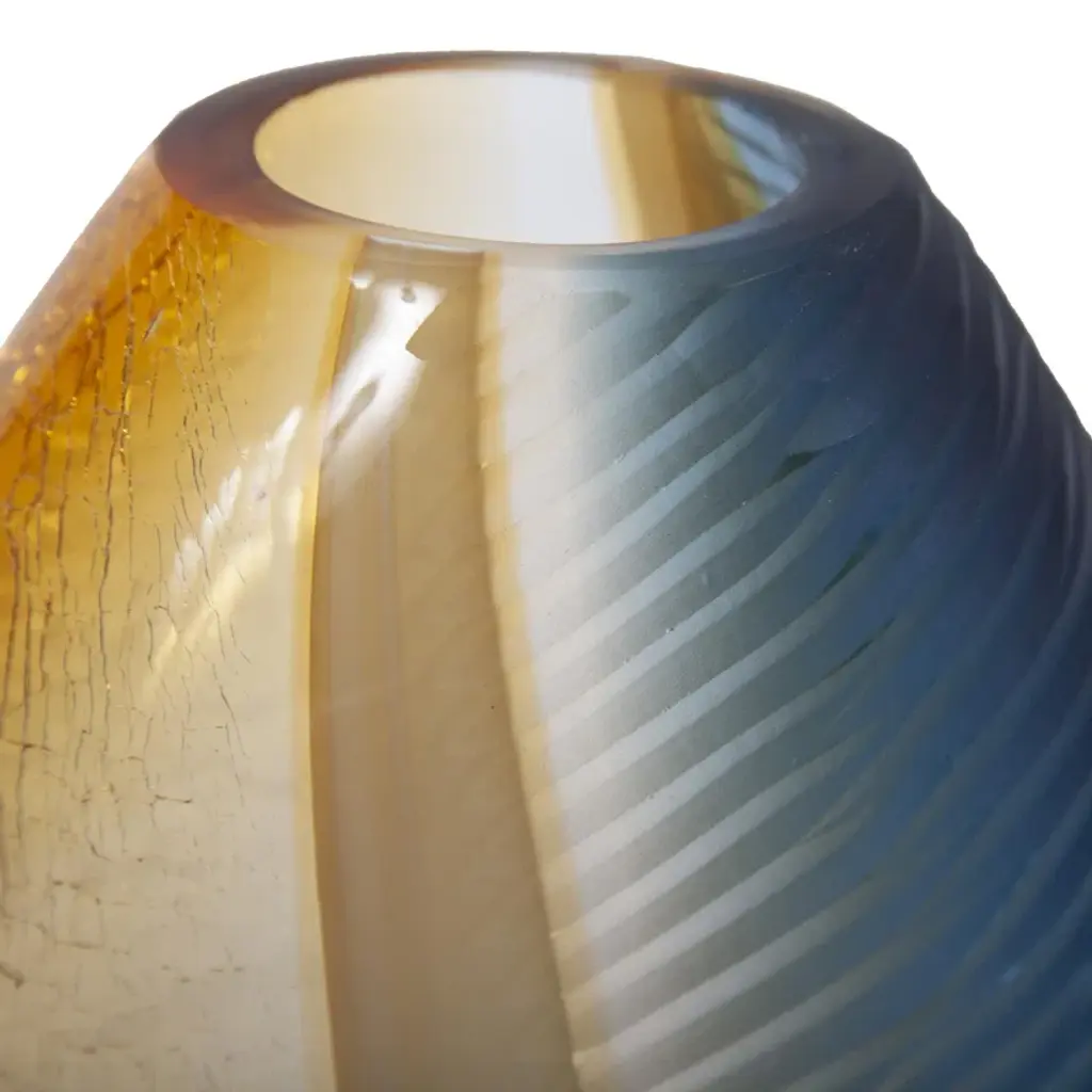 The Carthage vase is a stunning combination of amber and blue hand-blown glass, that flows together so effortlessly. It brings to mind the blue skies meeting at the horizon with the amber and gold foliage preparing for a seasonal change.