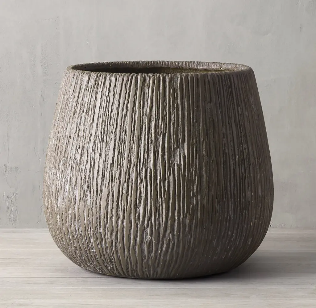 Hand texturing that mimics tree bark accents the spare, sculptural form of our planter. Crafted of concrete, the etched surface imparts an organic character that renders each piece unique.