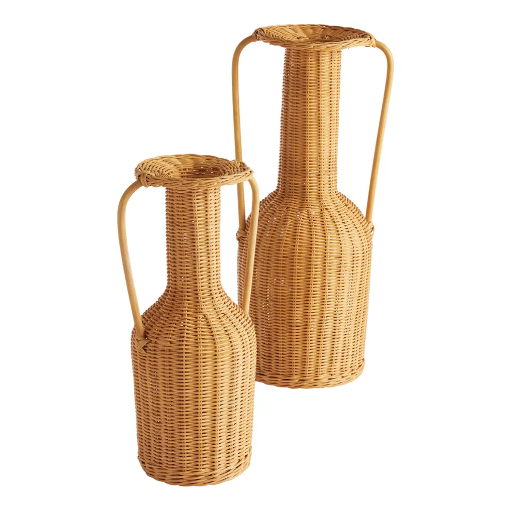 Bring airy, organic beauty to your home decor with this tall handled vase, hand woven in Indonesia from strands of natural rattan. Available in two ample sizes, it's especially gorgeous filled with dried grasses or oversized faux florals. Display it on the floor in your entryway or hearth or place it on a shelf or side table for a dramatic statement.