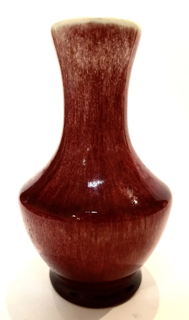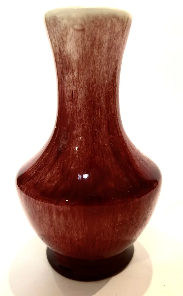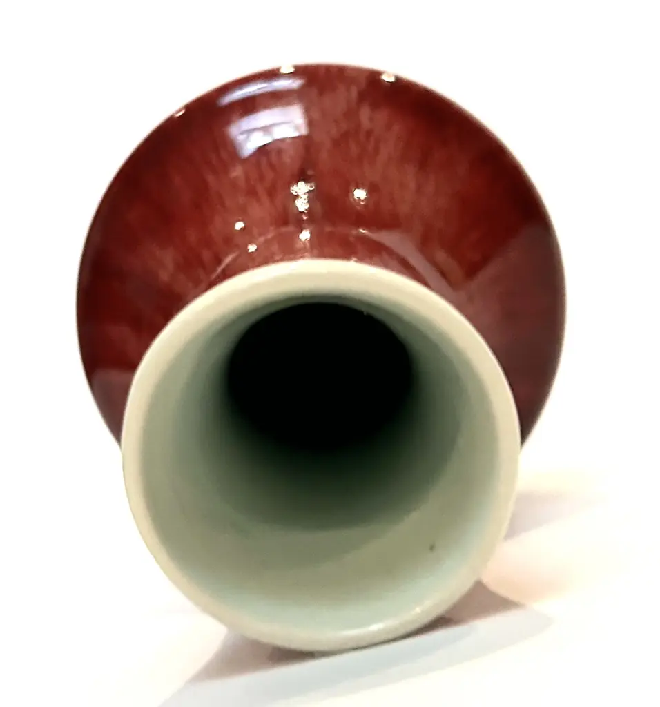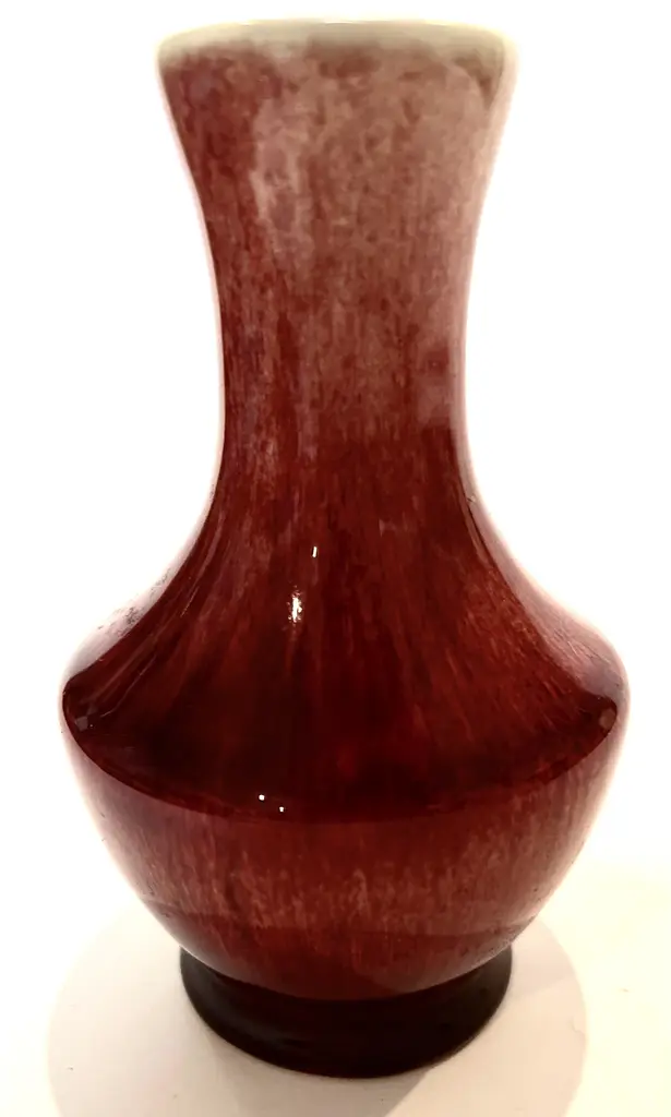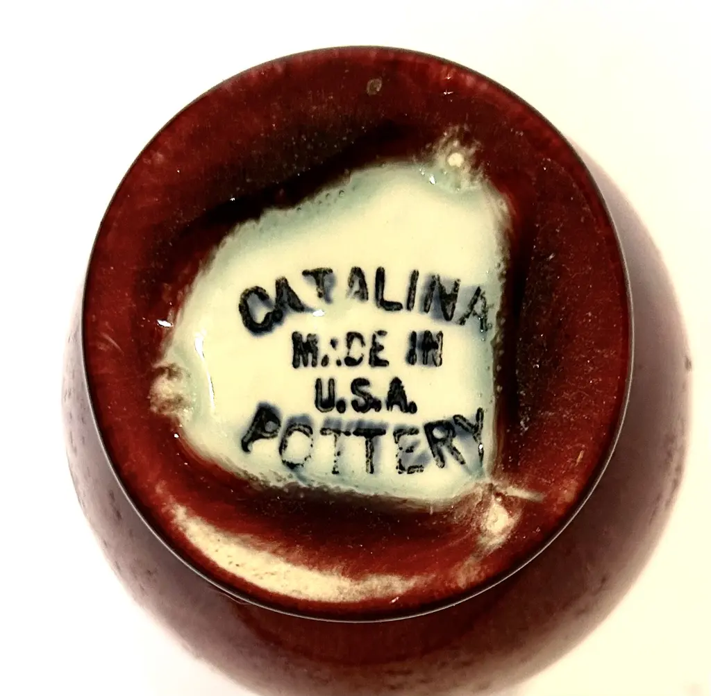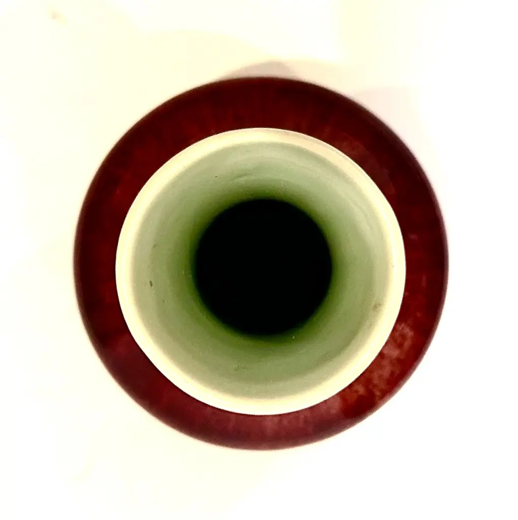 Hard to find Catalina Pottery vase with the highly-coveted oxblood glaze over an exquisite celadon glaze. Marked “Catalina Pottery Made in U.S.A.,” with marks used betweeen 1937 and 1942z