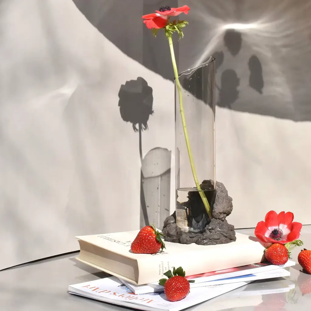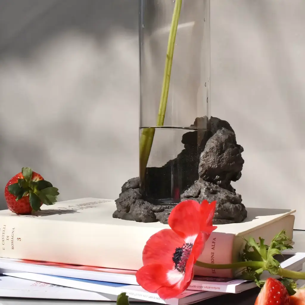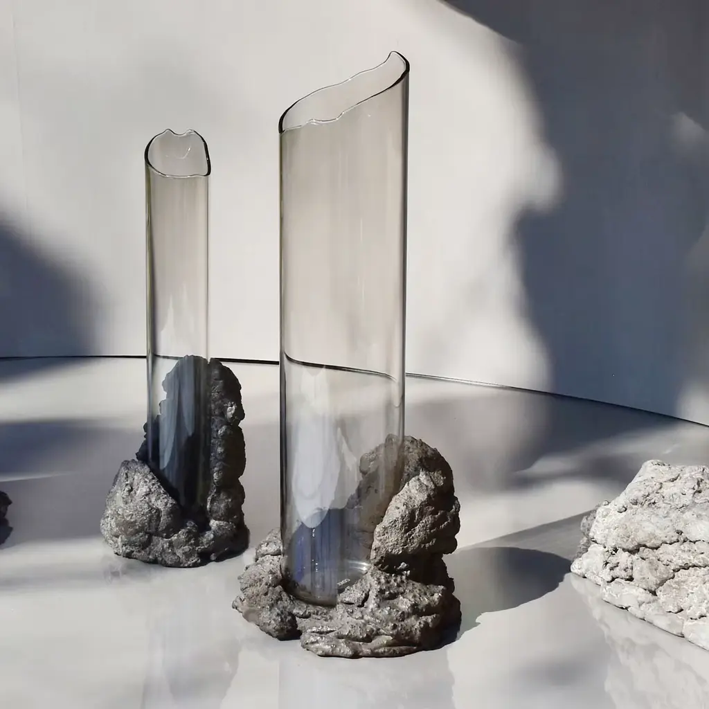 An evocative sculptural vase composed of two intersecting elements—glass shaped like flowing lava and textured stone formed from mineral fragments. The design features broken, sinuous lines symbolizing movement and transformation. Crafted using ancient techniques with natural materials free of industrial additives, it functions as both a flower vase and an independent art object, serving as a distinctive focal point in contemporary interiors. Slight variations in shape may occur due to its handcrafted nature.
