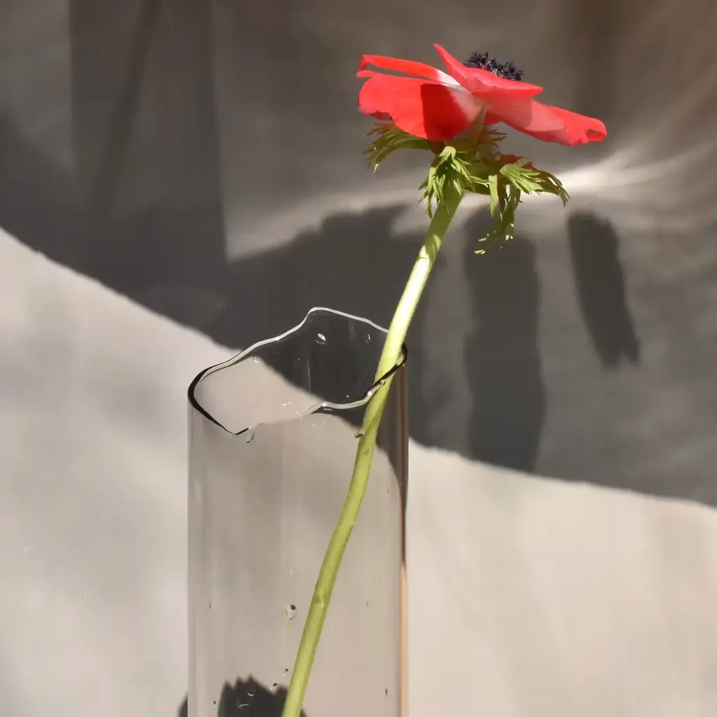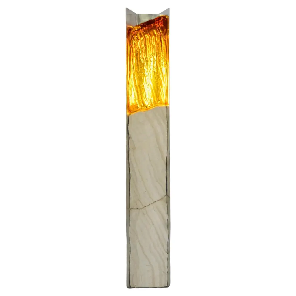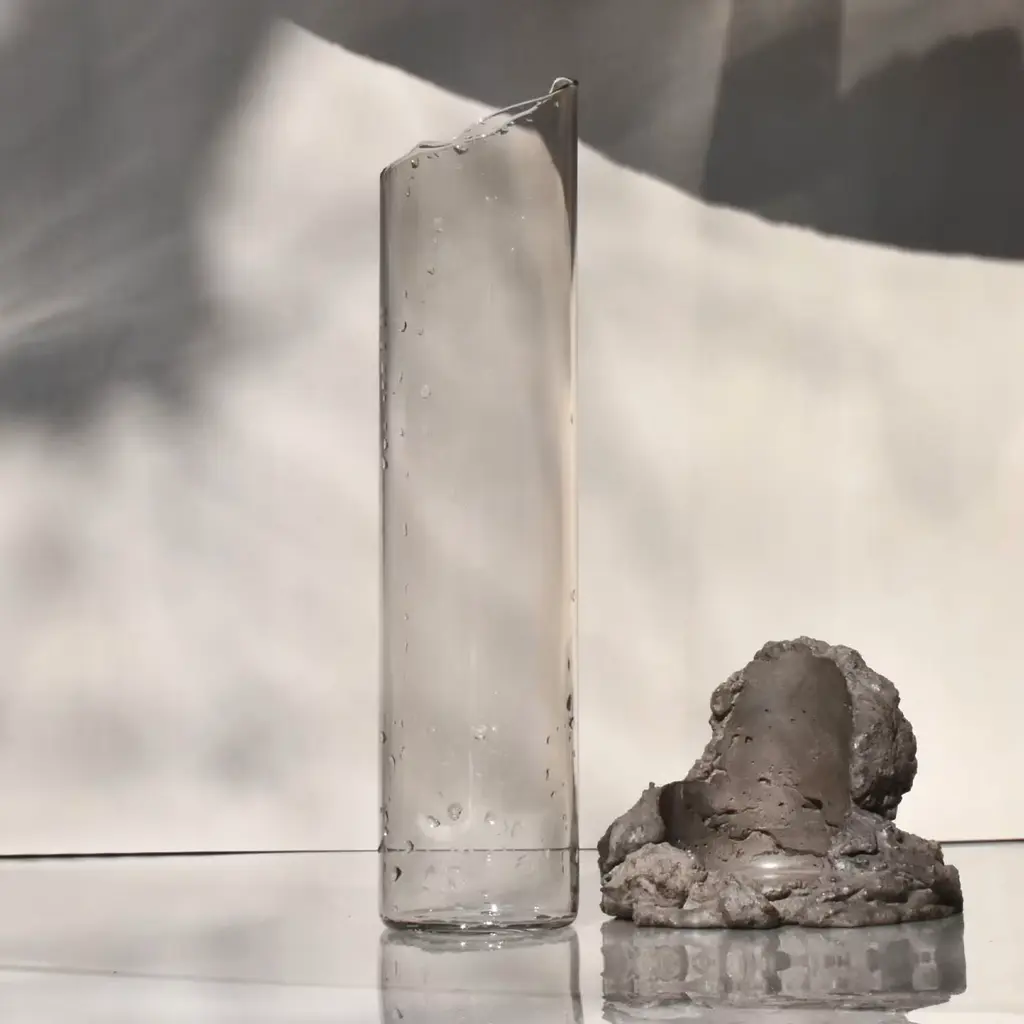 An evocative sculptural vase composed of two intersecting elements—glass shaped like flowing lava and textured stone formed from mineral fragments. The design features broken, sinuous lines symbolizing movement and transformation. Crafted using ancient techniques with natural materials free of industrial additives, it functions as both a flower vase and an independent art object, serving as a distinctive focal point in contemporary interiors. Slight variations in shape may occur due to its handcrafted nature.