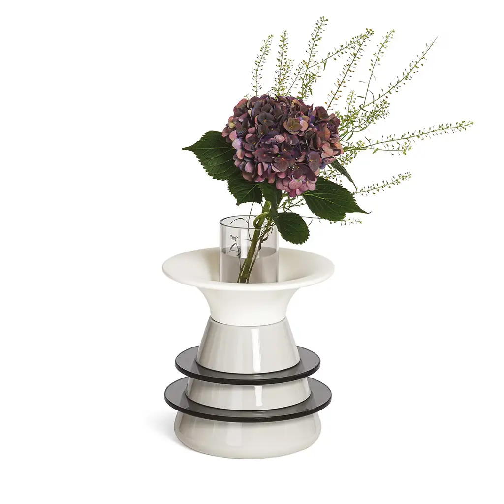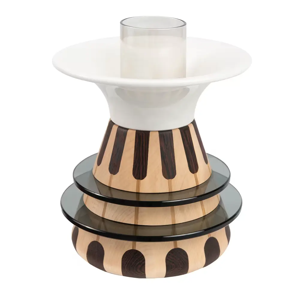 The new version of the Catodo Vase combines glossy or matte lacquered polyurethane with dark smoked glass for a synthetic yet intricate design language that explores unprecedented material combinations. Designer and artist Elena Salmistraro takes her inspiration from the historical period between the 1940s and 1960s. The Scapin Collezioni collection by Elena Salmistraro reflects these neo-tribal and post atomic symbols through precious inlays and innovative resin carvings on marble surfaces.