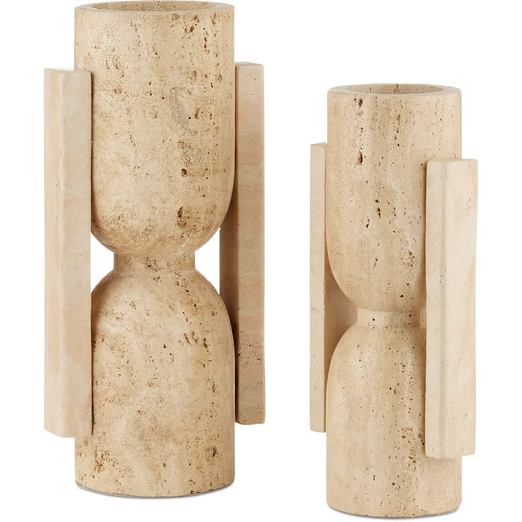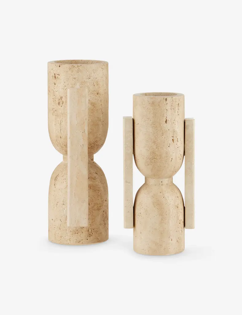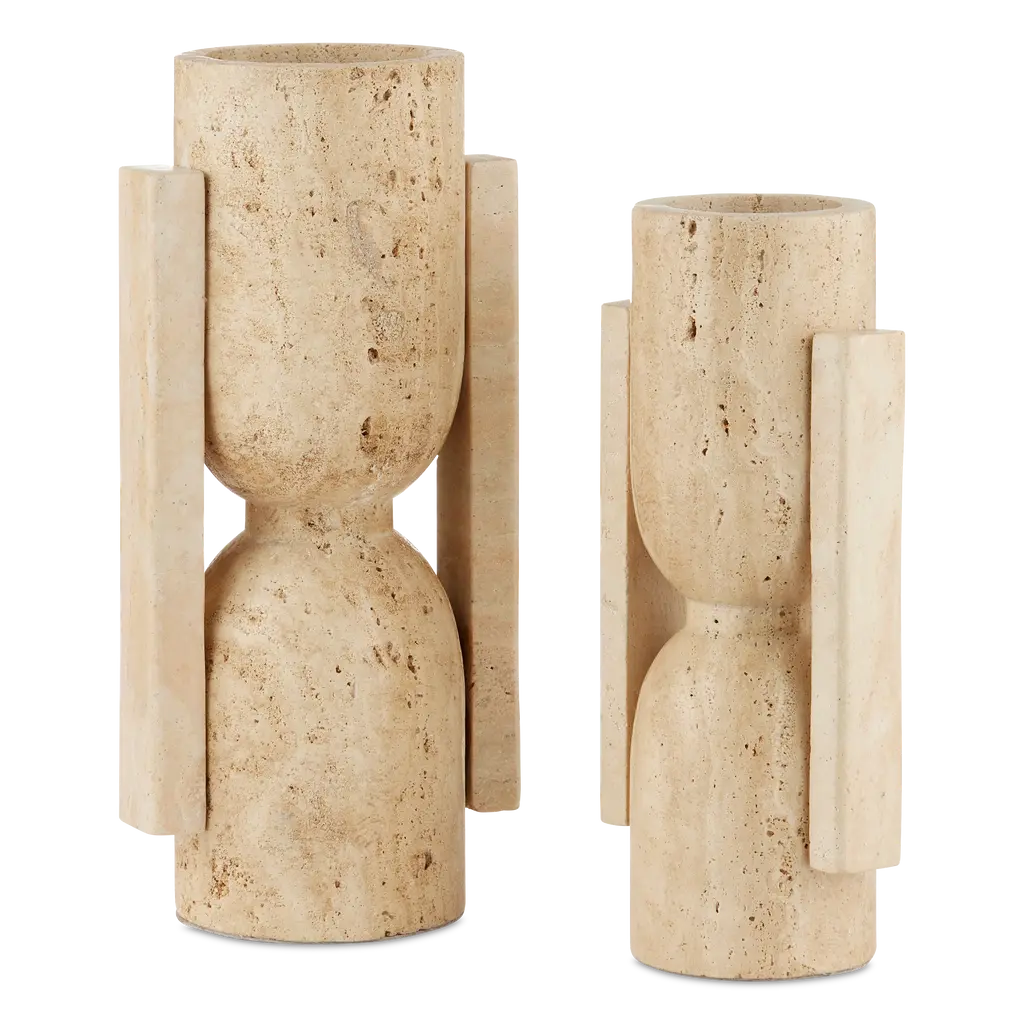 Beautiful hand-carved travertine meets brutalist design to bring an organic, modern flair to this set of vases. Perfect for displaying dried greenery or simply offering depth and dimension in a sophisticated tabletop or counter display.