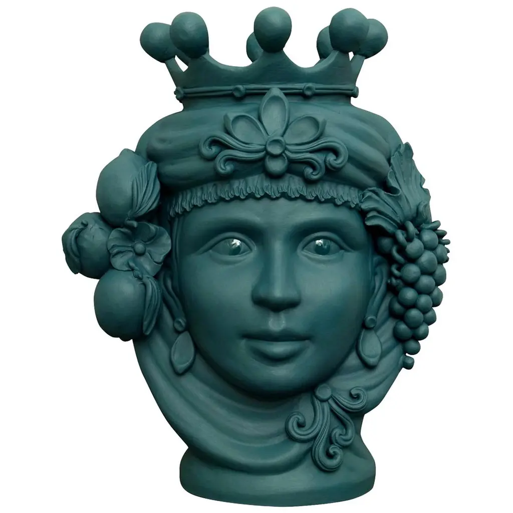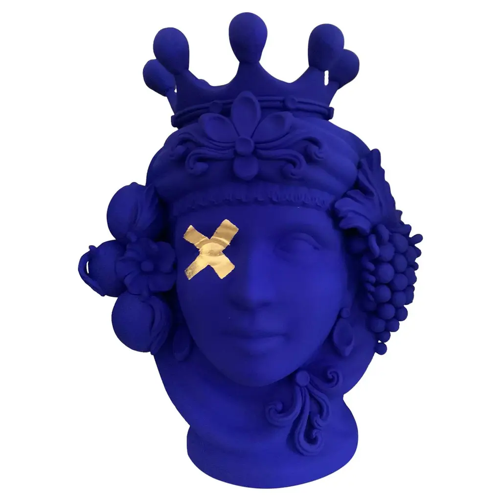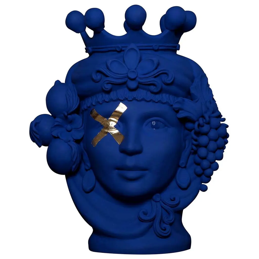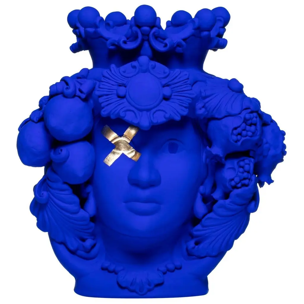 Every piece in this exceptional range of Greek mythology inspired vases has been carefully and entirely crafted by hand. The spectacular Cecì Vase in terracotta is painted with a vivid matt blue finish and features two decorative strips in gold leaf crossing over one eye of the ancient deity.