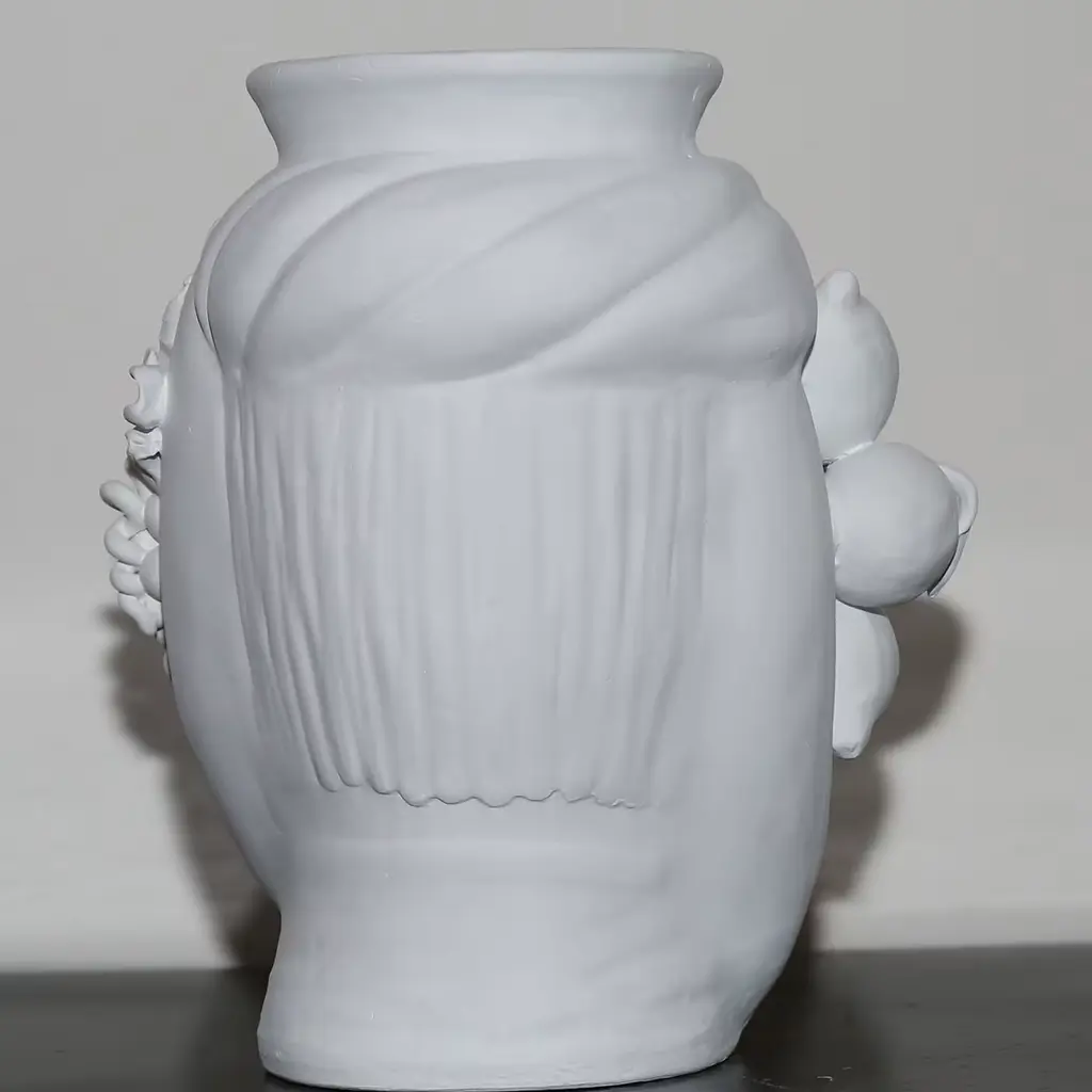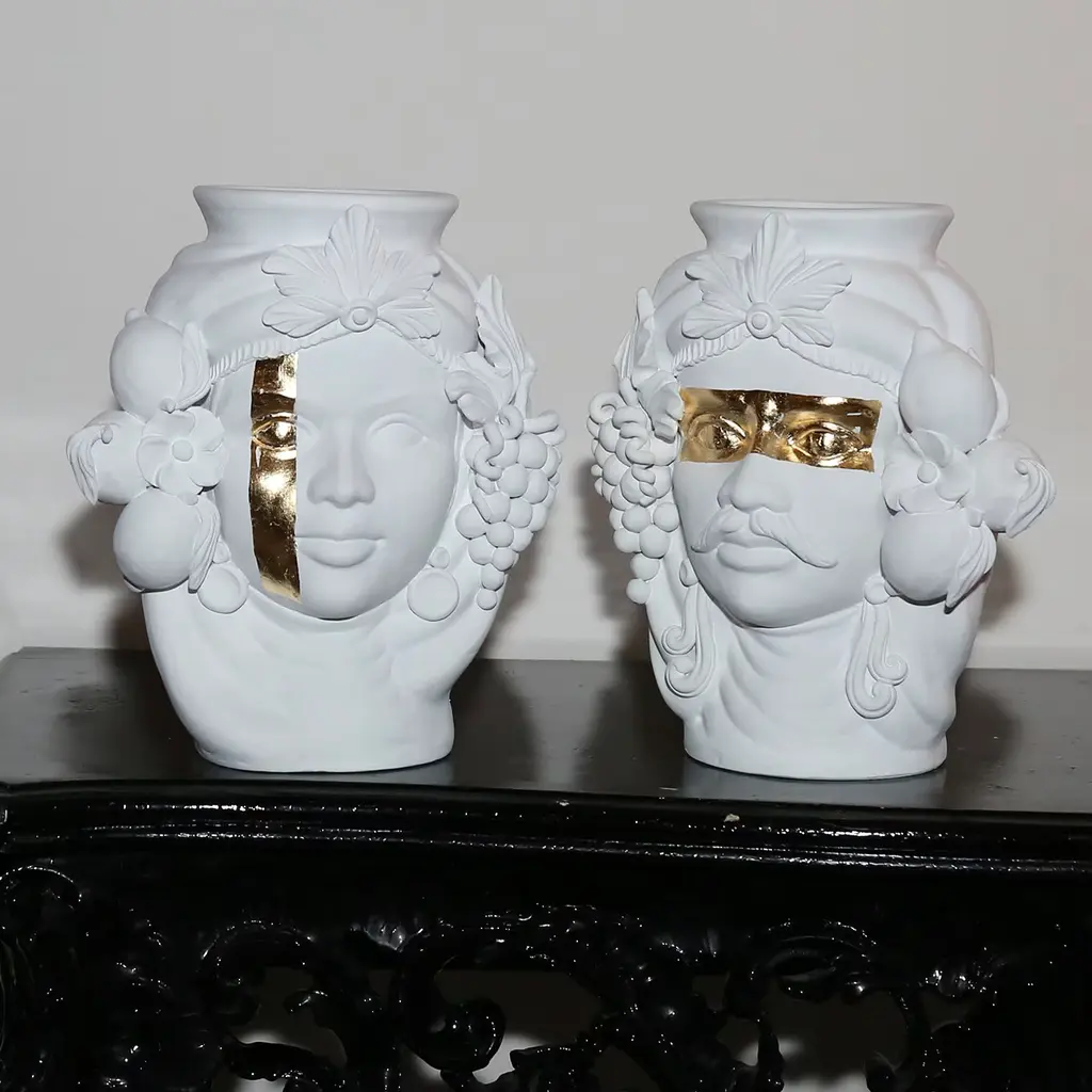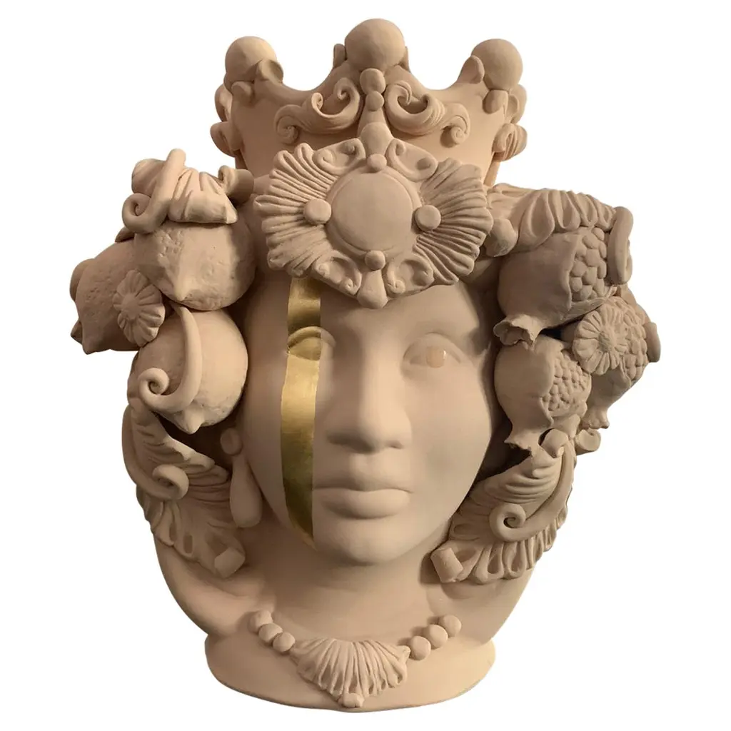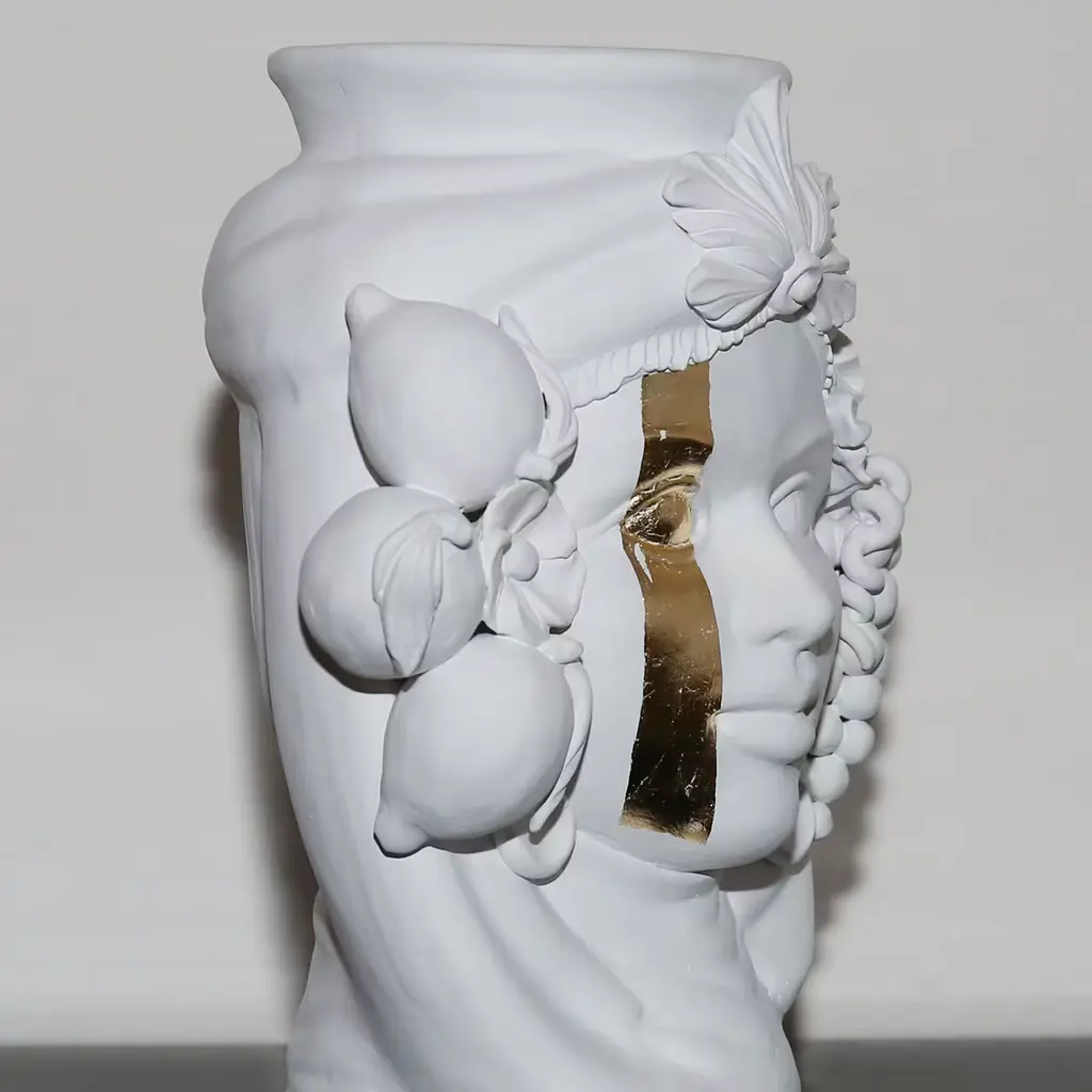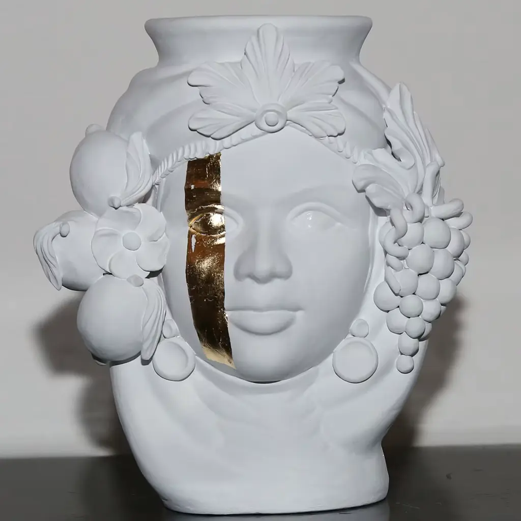 A poetic ode to traditional craftsmanship and modern sensibility, this anthropomorphic vase of a Sicilian woman evokes the grandeur of the Moorish conquest in Sicily. Entirely handcrafted by master ceramicist Stefania Boemi, this vase boasts an expressive visage marked by an ornate headdress, pendant earrings, full lips, and luscious locks of hair intertwined with Sicilian fruits. The right eye features a gold foil band running vertically down the face, a captivating detail that emphasizes the beauty of the woman's gaze. The vase cannot be filled with water.