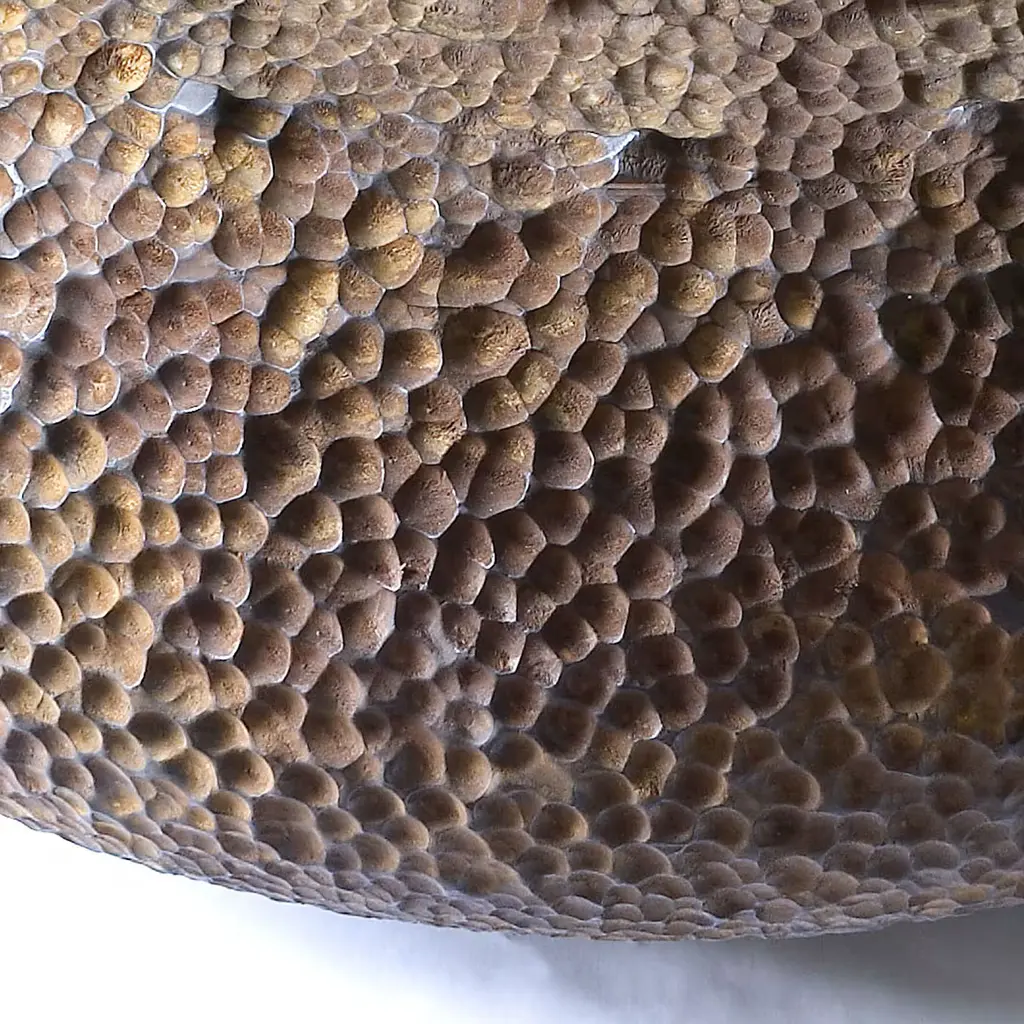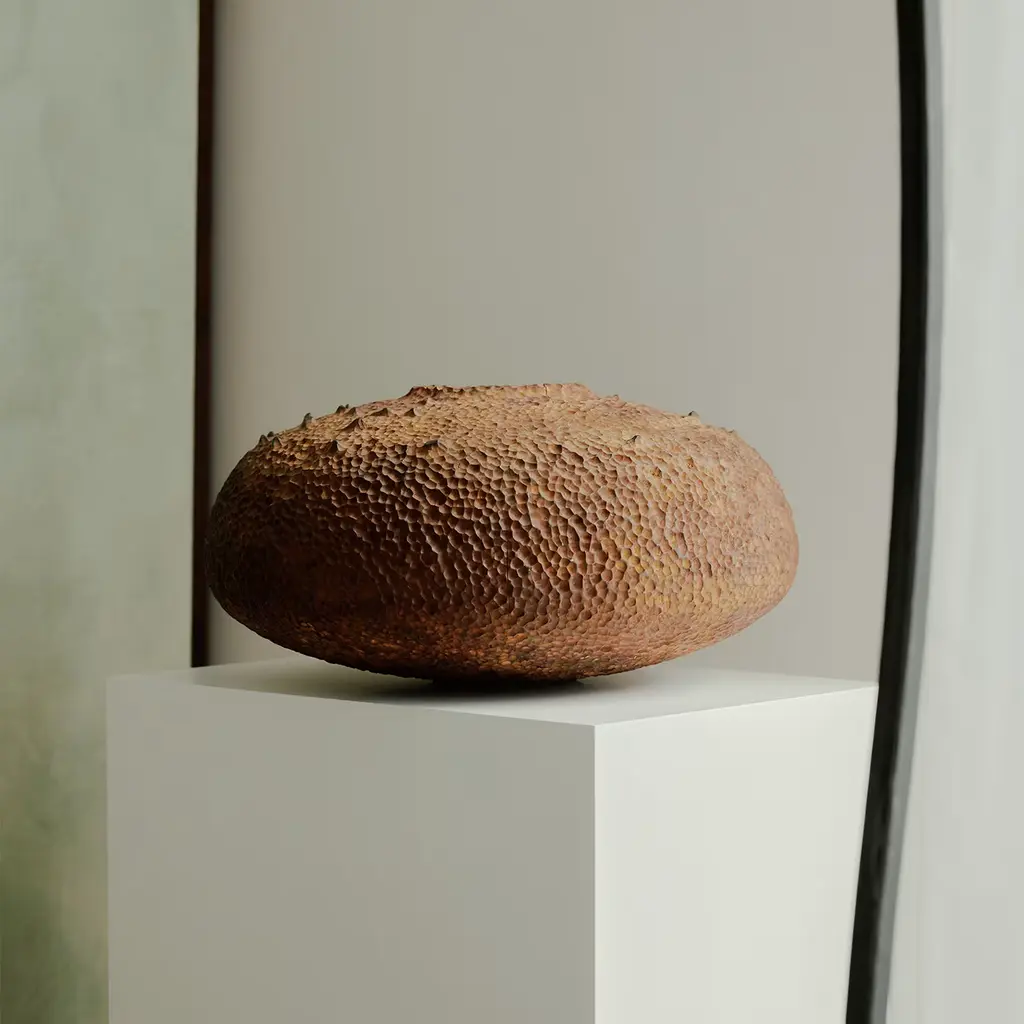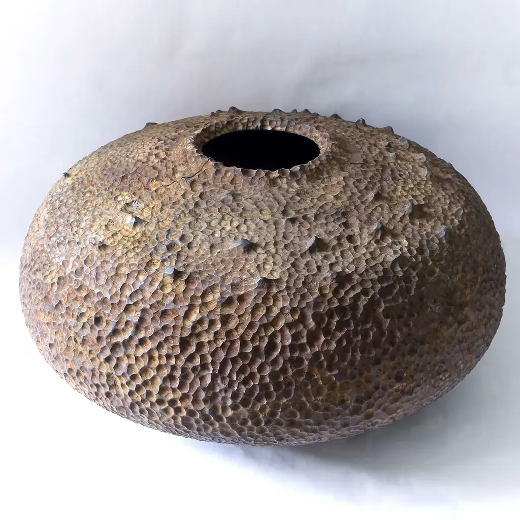 This magnificent vase was hand-turned from a singular piece of Lebanon cedar tree. What makes this piece strikingly modern is the fact that the traditional texture of the wood was modified to obtain a surface that resembles the surface of a distant planet with a multitude of incisions, accompanied toward the top by a series of protruding elements that make it resemble the skin of a reptile. This exquisite piece will make an arresting effect in any room. This piece is currently on show and immediately available at Artemest Galleria New York.
