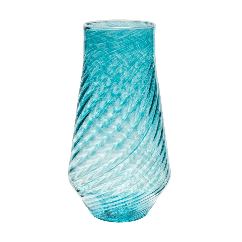 Add a thoughtful flair of fancy to your table with Celerie Kemble's glassware in whimsical color combinations and modern shapes. The Twisty Vase is hand blown using an optic mold to achieve a textured, spiral pattern. Finished with a glossy colored rim, this vase is the perfect vessel to dress up your table and show off your favorite flower. Shop Celerie's latest designs, exclusive to Chairish! About the Maker: Hayden Wilson is a glass artist and sculptor who owns and operates a private glass studio in Asheville, NC. Hayden's beautiful glassware is all handmade and mouth-blown -- each uniquely a work of art. Care Instructions: Dishwasher Safe. Due to the handmade nature of this glassware, colors and glass heights may vary slightly.