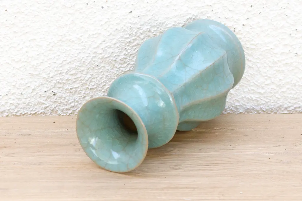 A small sculptural vase that exudes timeless elegance and grace. Its fluted form is enhanced by a delicate light blue crackle glaze, showcasing a prized antique technique. Likely from the early 20th century, its celadon hue and intricate fissures reflect age and artistry. Once a decorative or ceremonial piece, it now shines as a stunning accent or vase for a single bloom, blending classic beauty with modern charm.