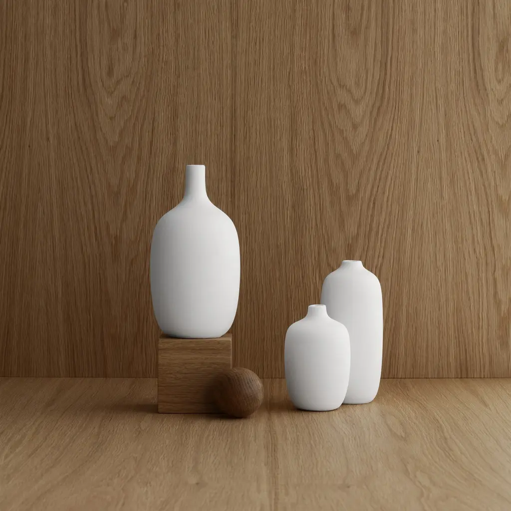 With the CEOLA Vase Ceramic by German designer Frederike Martens, the greens in your life have found a new home. The collection comprises five different shapes and sizes in either a soft white or a soft and sandy shade of khaki, but all with the same narrow mouth presenting the plant in a beautiful upright position while making sure the stem will not bend or break. The rounded, organic silhouette of the vase is inspired by traditional Japanese metal vases. The surfaces of the CEOLA series are made of resistant ceramics, glazed but left a bit course. Small bumps, slight color variations and visible lines are the result of the production process and add to the natural look as well as the unique character of every single vase. Gather a few of your favorite flowers – or simply collect wild twigs that add a rustic, natural feel to your interior décor. Features