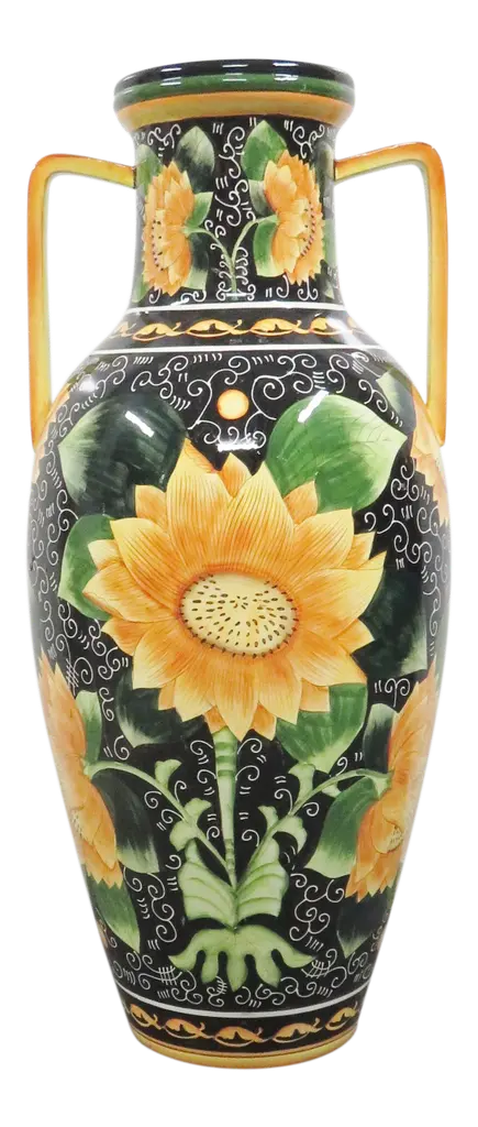 A captivating work of art, this stunning ceramic vase will enliven any decor. An array of overlapping banana leaves lined in exquisite gold-coin adorn the surface, the deep green hues of leaves elegantly contrasting with the metallic accents. Its distinctive, curvy shape with the narrow base and flared, bulb-shaped neck enhances the naturally ridged leaves. Stylish in an entryway or in a living room, this vase is perfect on its own or paired a lovely bouquet of flowers.