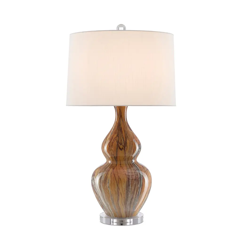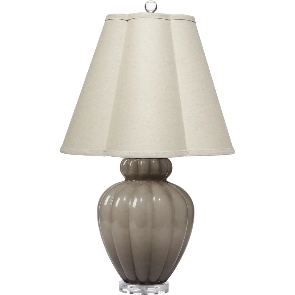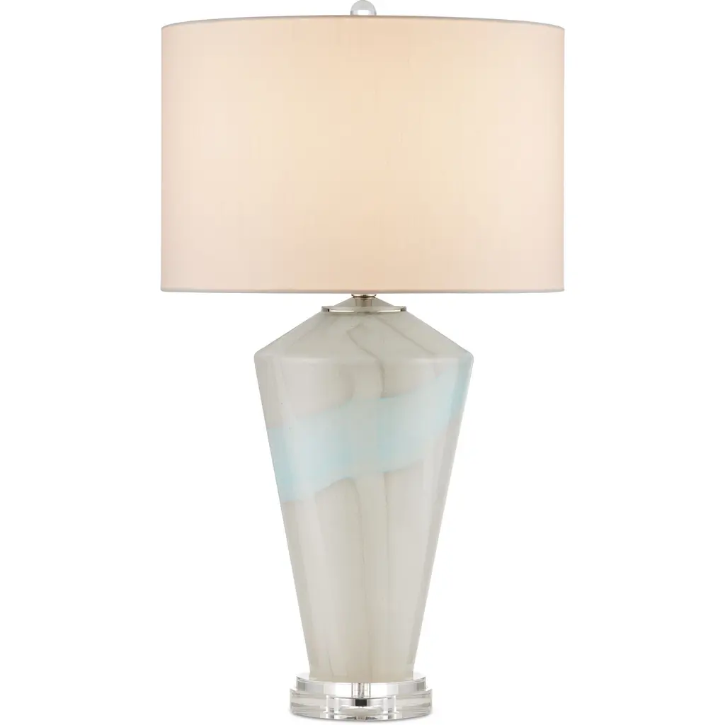 36.25"H A ceramic urn table lamp in gradated tones of blue mist with an acrylic base. Shade: 16" X 18" X 11.5", Off White outside and White inside, Man-Made Linen and Man-Made Silk, Round. 3 Way, 150 Watt Max, Type A Bulb, 9.5" Nickel Harp, Turnkey