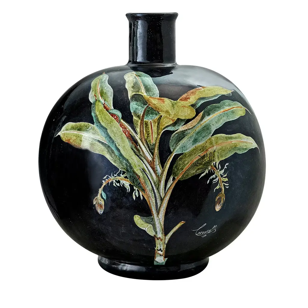 An elegant juxtaposition of form and color, this lovely ceramic vase exudes classical allure. Bold frond elements in high relief accented in lavish gold-coin dance across the surface of the vase, creating alluring color contrast and textural depth. The distinctive conical shape with its narrow base and delicately tapered, gold-rimmed mouth imbue the work with an uncharacteristic lightness and dynamism. Perfect as a centerpiece on a table or an entryway console, this piece is sure to impress.