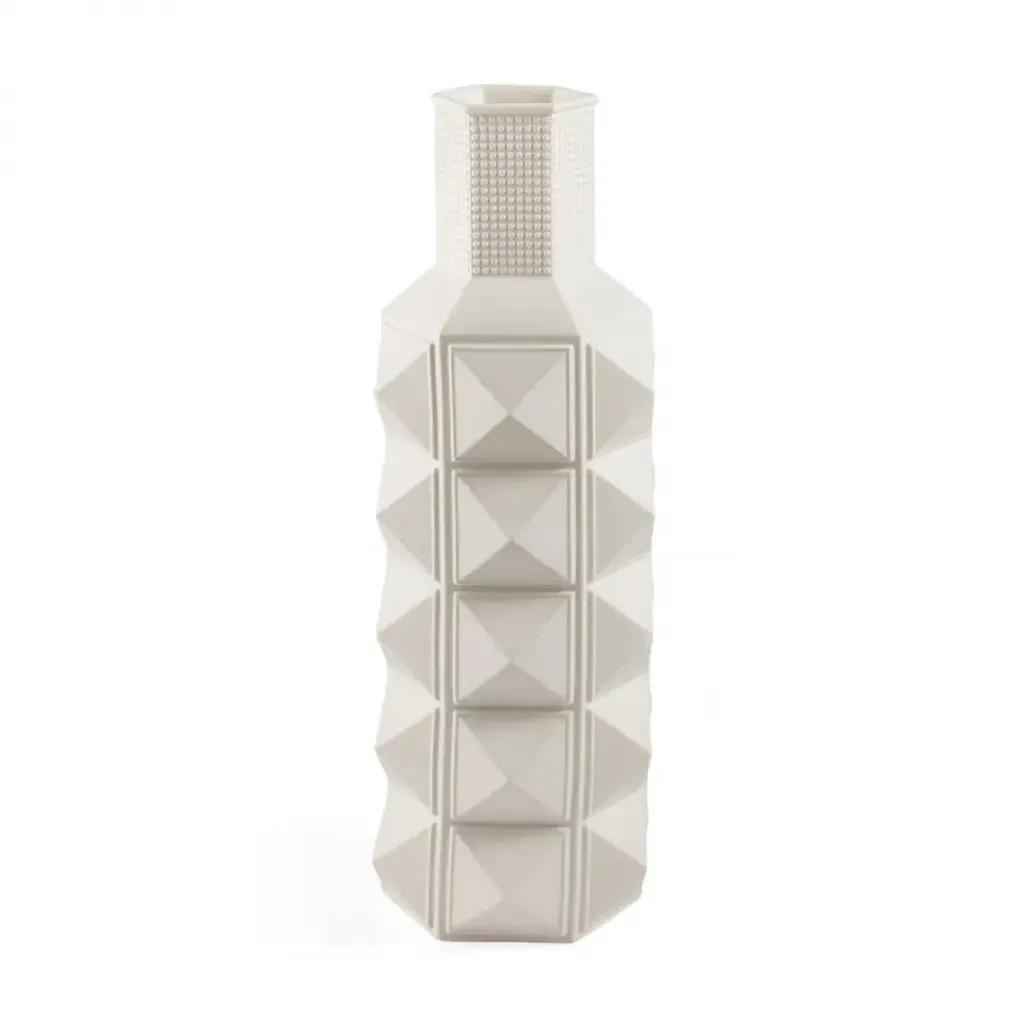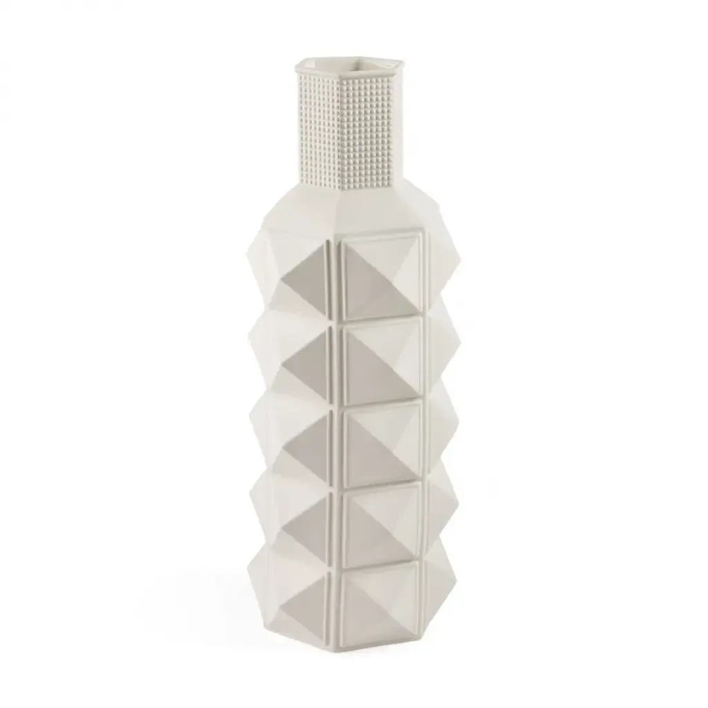 Show Stopper.Edgy and elegant at once, our Charade collection features glamorous, thoughtfully hand-carved details cast in the highest quality matte porcelain. With sharp lines and a graphic silhouette, our Charade Studded Low Vase also features a timeless unglazed exterior for added dimension. Tough glamour has never looked so good: perfect on an entryway console or taking center stage in a blanc tablescape.