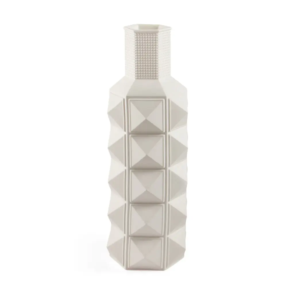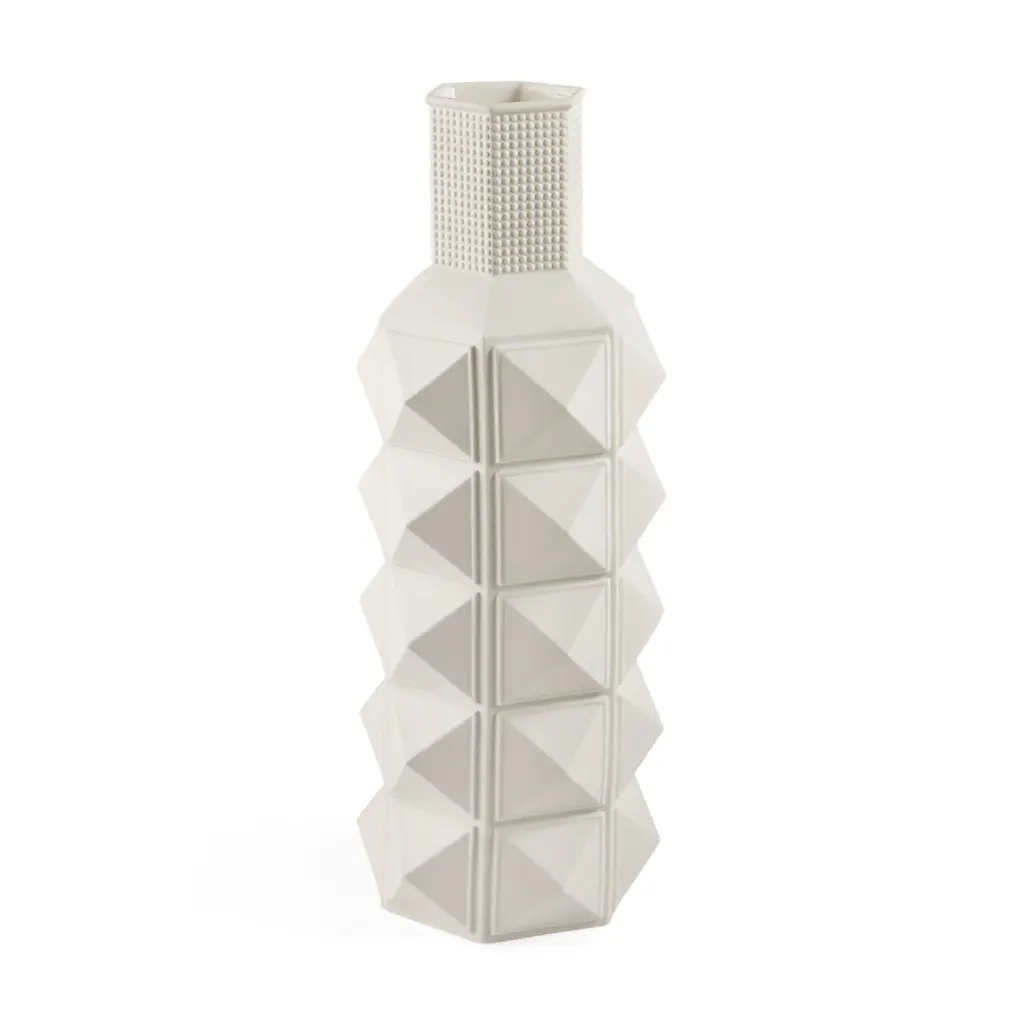 Show Stopper. Edgy and elegant at once, our Charade collection features glamorous, thoughtfully hand-carved details cast in the highest quality matte porcelain. With sharp lines and a graphic silhouette, our Charade Studded Low Vase also features a timeless unglazed exterior for added dimension. Tough glamour has never looked so good: perfect on an entryway console or taking center stage in a blanc tablescape.