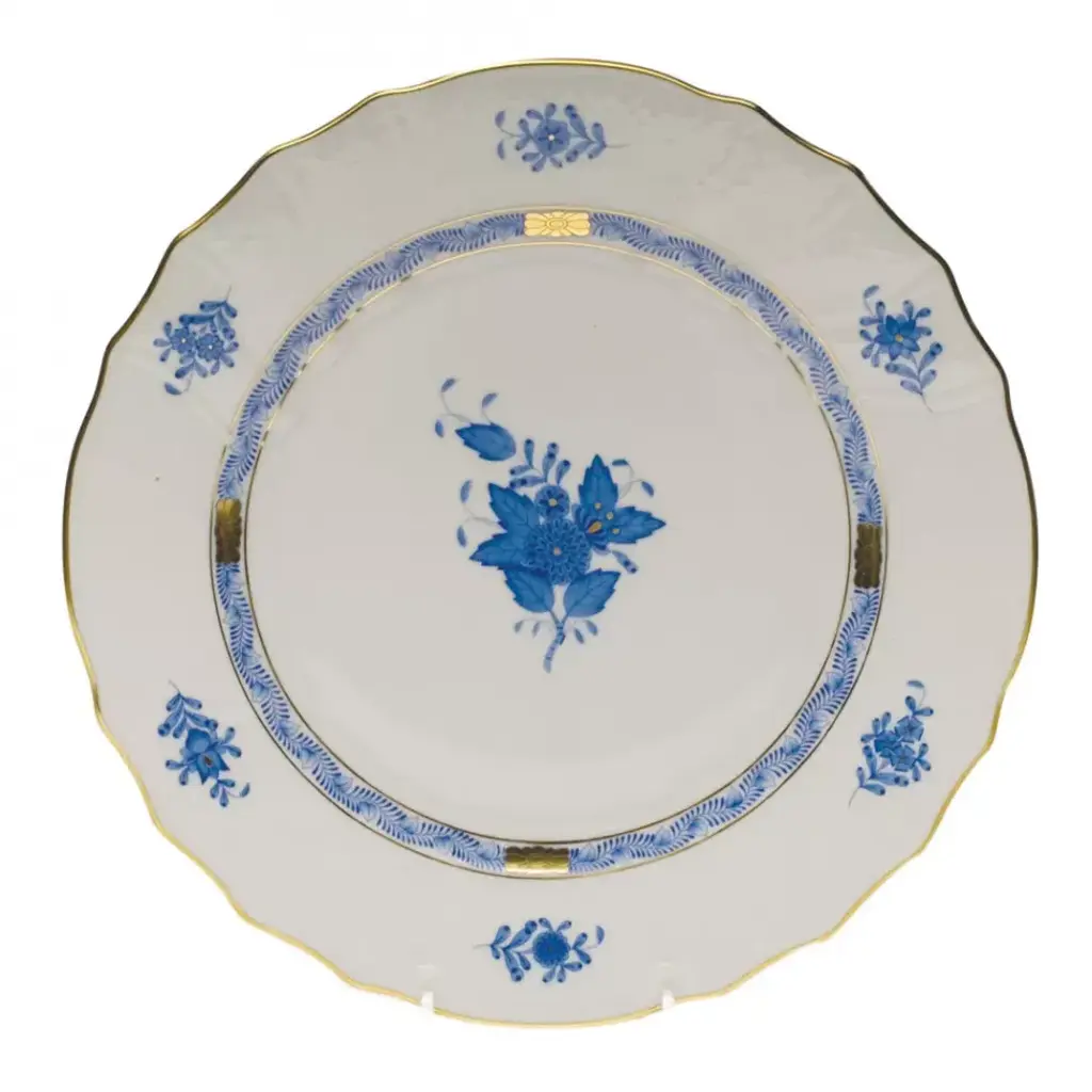 A Herend classic. Originally created in 1930 for Count Albert Apponyi, the pattern features a center motif of a stylized peony surrounded by a garland of leaves with 24K gold rosettes. It is available in multiple color options. Hand painted in Hungary. Now the biggest porcelain manufactory in Europe, Herend was founded in 1826 to produce earthenware in the small Hungarian village for which it was named. At the time, Hungary was flooded with low-cost pottery, but in 1839, Mor Fischer became the Manufactory’s new owner and he decided to focus on producing dinnerware replacement pieces for Europe’s royal families to complement their valuable porcelain patterns from Germany and the Far East. As his client base grew, Fischer commissioned his artists to begin designing dinnerware patterns of their own. Queen Victoria’s 1851 purchase of a large set for Windsor Castle was a milestone, setting the stage for aristocrats throughout Europe to clamor for Herend in their estates. In the 1850s, Herend added meticulously-crafted figurines to its creations. Herend’s trademark fishnet pattern, which is widely recognized and prized as Herend’s signature design, started in 1858 when an artist who was intrigued with a Chinese plate’s fish scale design painted it onto a rooster figurine to imitate feathers.
