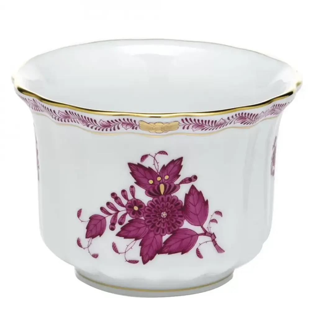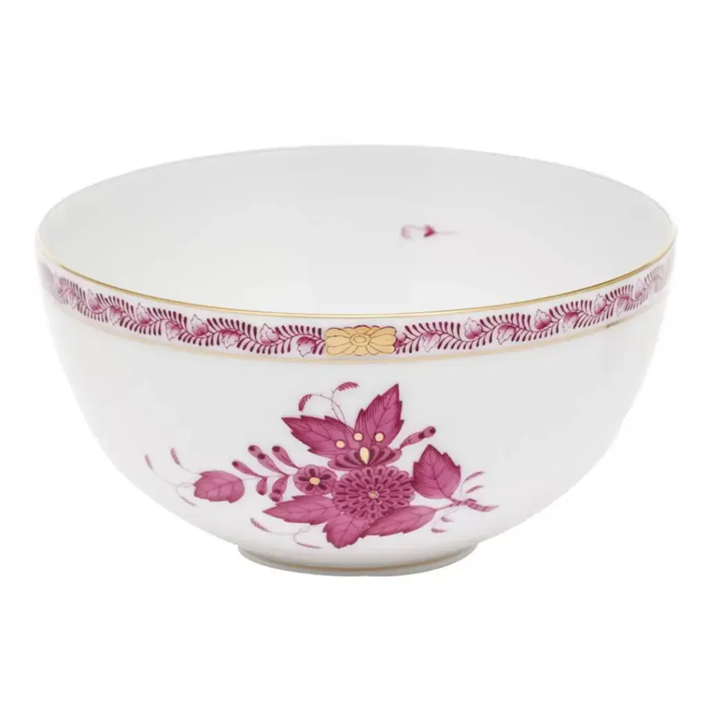 A Herend classic. Originally created in 1930 for Count Albert Apponyi, the pattern features a center motif of a stylized peony surrounded by a garland of leaves with 24K gold rosettes. It is available in multiple color options. Hand painted in Hungary. Now the biggest porcelain manufactory in Europe, Herend was founded in 1826 to produce earthenware in the small Hungarian village for which it was named. At the time, Hungary was flooded with low-cost pottery, but in 1839, Mor Fischer became the Manufactory’s new owner and he decided to focus on producing dinnerware replacement pieces for Europe’s royal families to complement their valuable porcelain patterns from Germany and the Far East. As his client base grew, Fischer commissioned his artists to begin designing dinnerware patterns of their own. Queen Victoria’s 1851 purchase of a large set for Windsor Castle was a milestone, setting the stage for aristocrats throughout Europe to clamor for Herend in their estates. In the 1850s, Herend added meticulously-crafted figurines to its creations. Herend’s trademark fishnet pattern, which is widely recognized and prized as Herend’s signature design, started in 1858 when an artist who was intrigued with a Chinese plate’s fish scale design painted it onto a rooster figurine to imitate feathers.