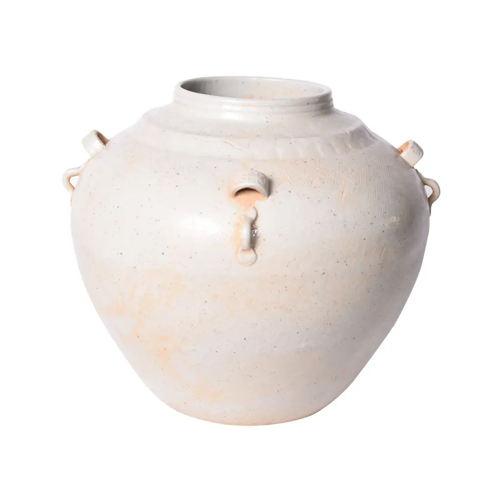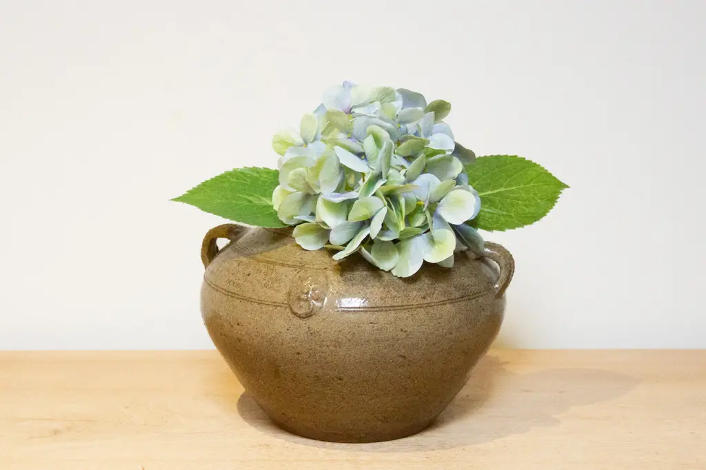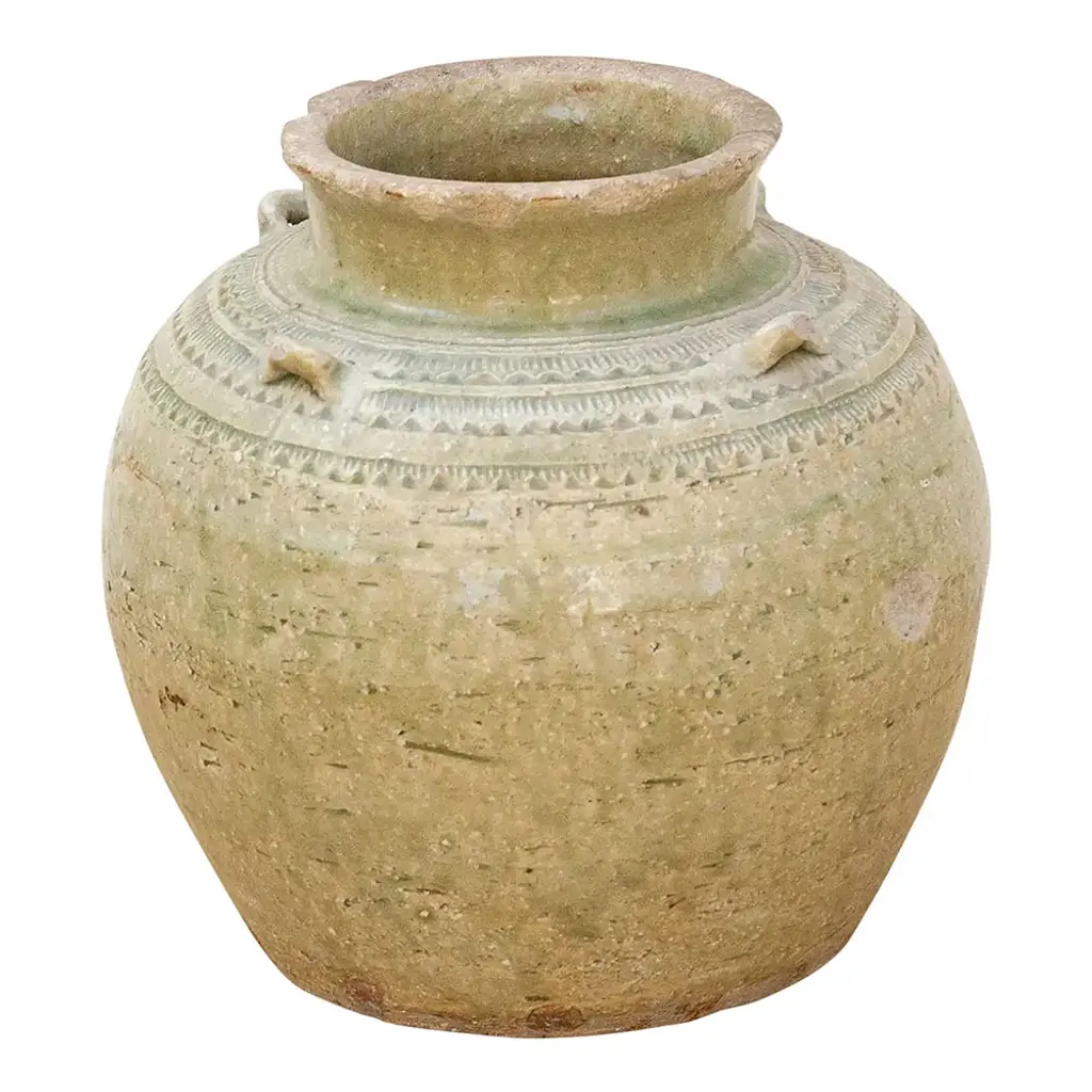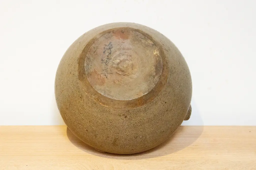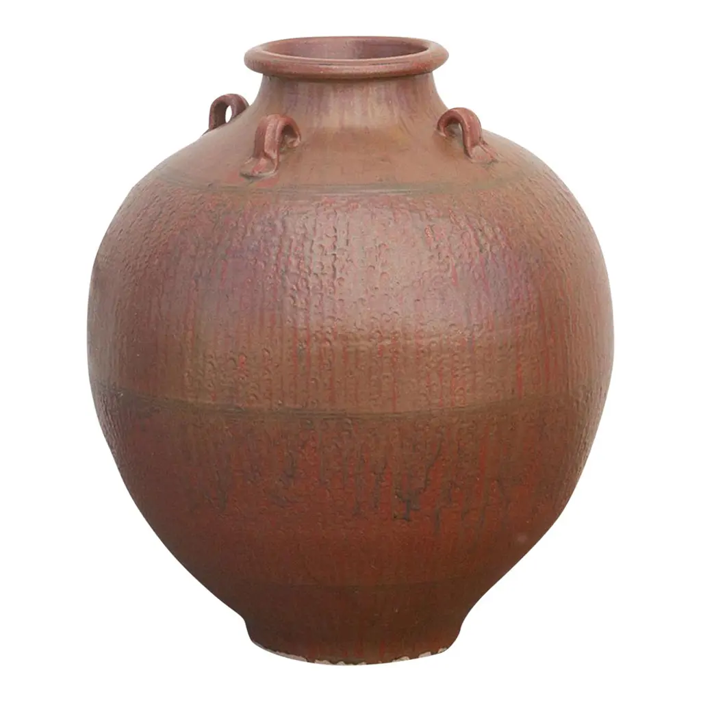 Vintage Chinese Yue ware porcelain vase. The vase, of tapered ovoid form, boasts two raised handles and a striking dragon face design. Its surface is meticulously covered both inside and out with a captivating mottled brown glaze, halting at the unglazed bottom for an authentic touch. The dragon face design adds a mythical and powerful element to the piece, enhancing its visual appeal.