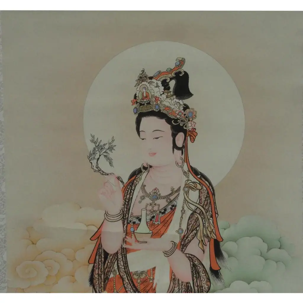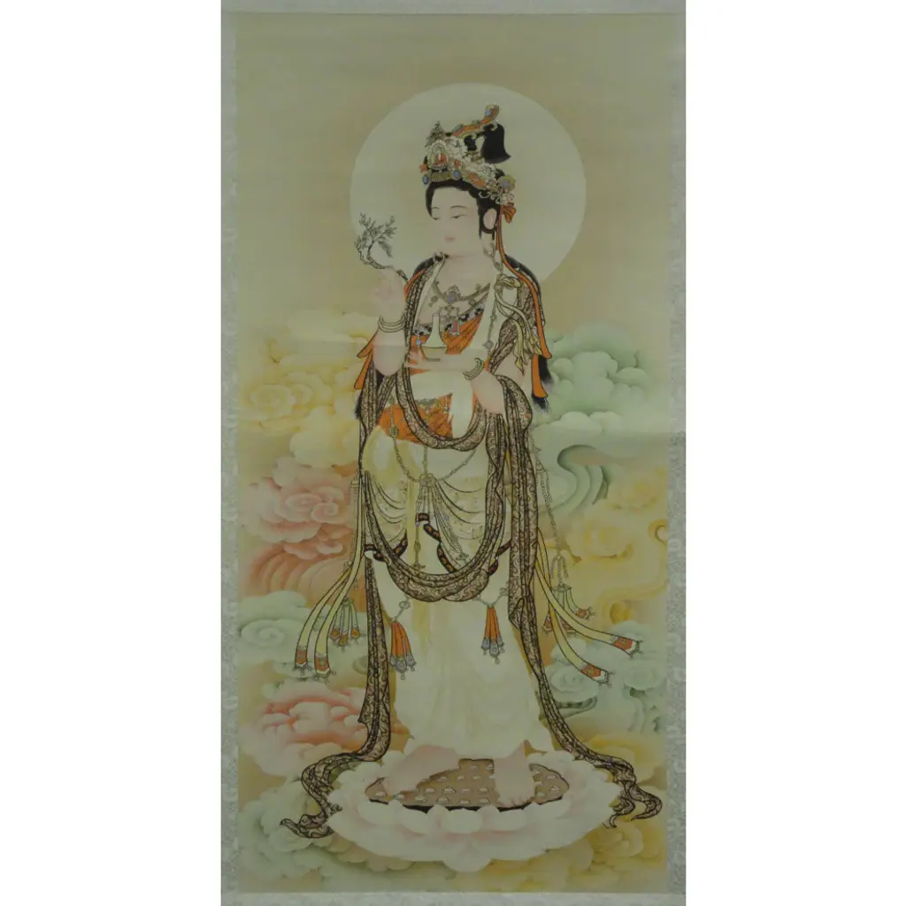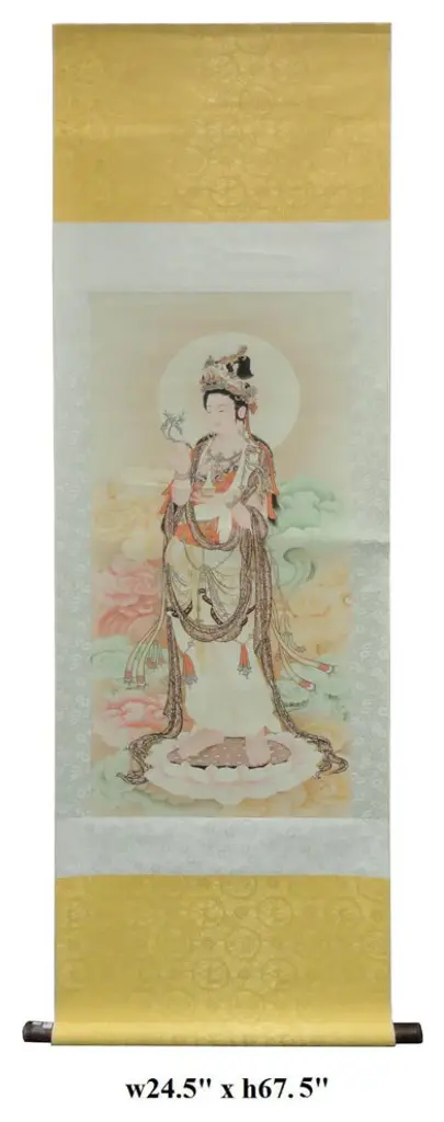 This is a Chinese hand painted Kwan Yin motif scroll. In this painting, Kwan Yin is standing on a lotus stand with willow leaves and spring dew vase in her hands. There are a full moon and colorful fortune clouds on her back as background.Dimensions: w24.5" x h67.5"Origin: ChinaMaterial: Paper. Condition: Good USA domestic continental buyers of 48 states pay $39.95 shipping (buyers of Hawaii, Alaska, US Islands, Florida Keywest, and Canada pays the extra shipping cost). Insurance and handling charges are already included in the shipping cost.
