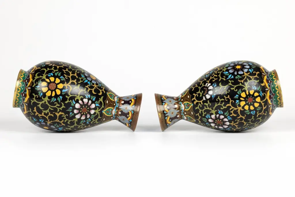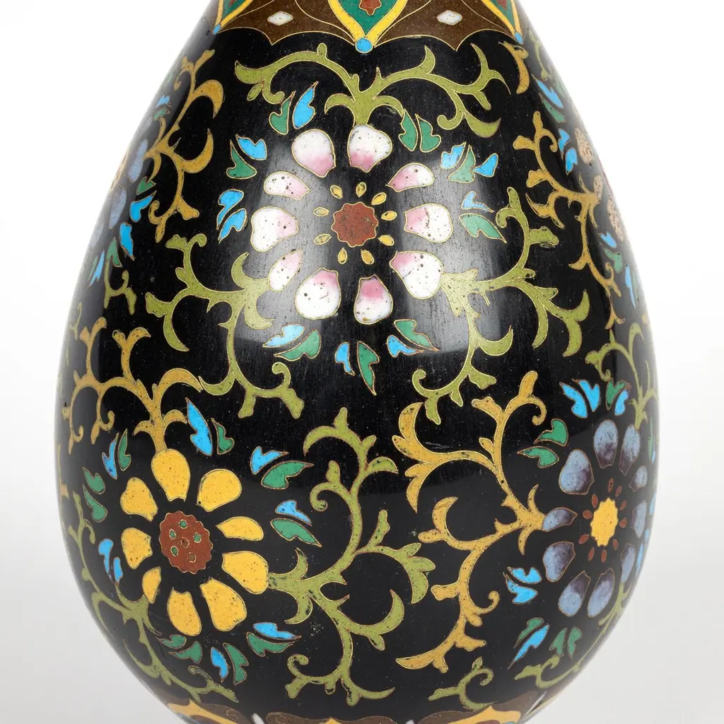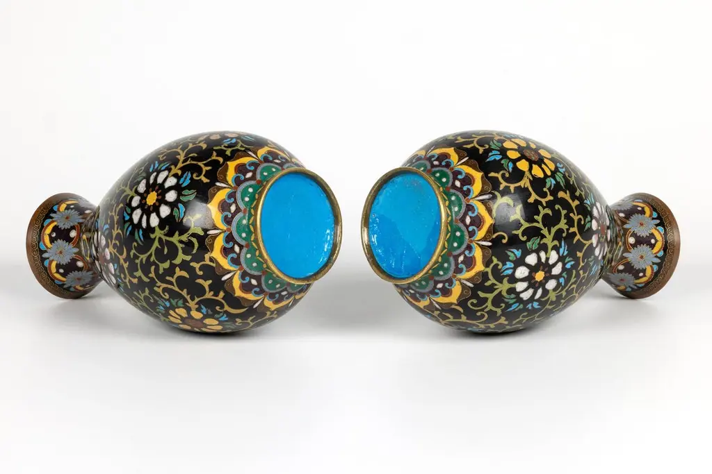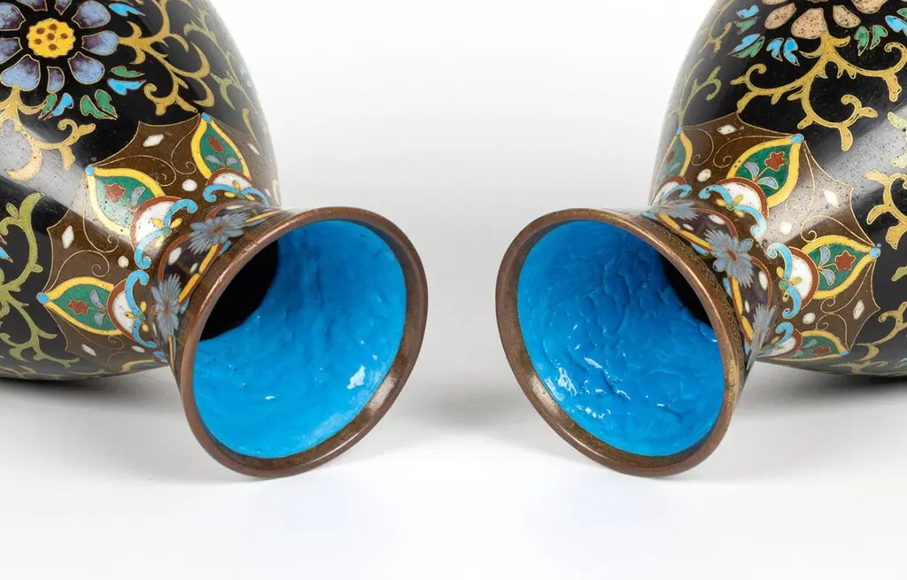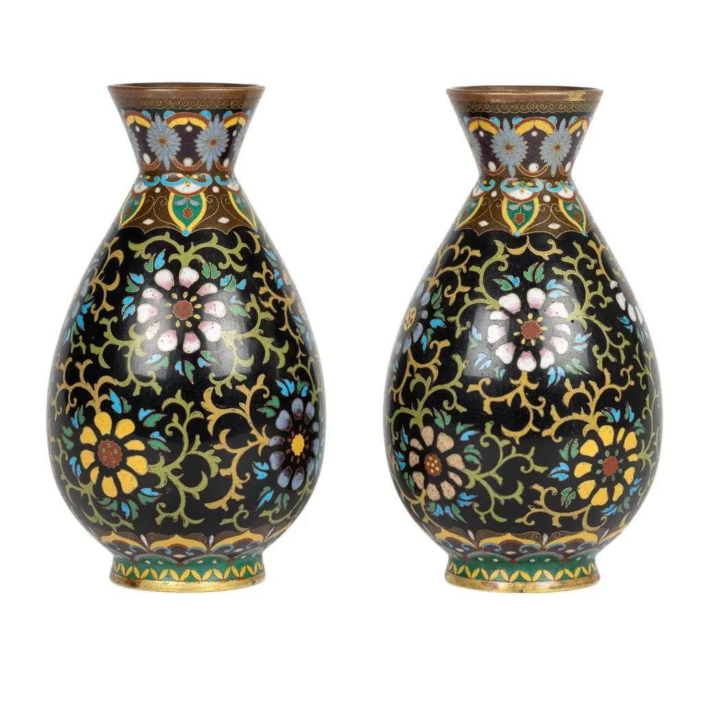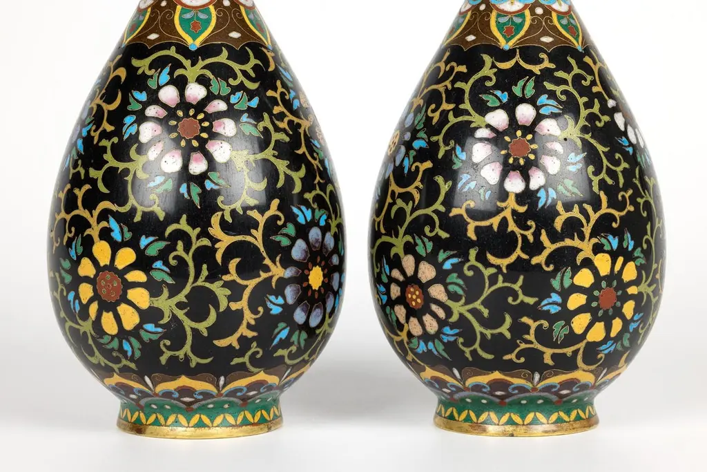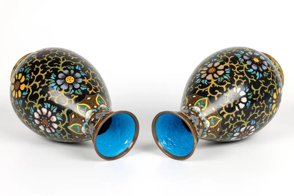 An exceptional and stunning pair antique Chinese Qing cloisonné enamel vases decorated with floral patterning dating from the late 19th or early 20th century. The bulbous bottle shaped vases stand raised on a narrow conical shaped foot with tear drop shaped bodies with a pinched neck and trumpet shaped top. The vases are decorated with repeat floral designs in various colored enamels with trailing leaf designs set against a black enamel ground. Decorative borders are applied around the upper and lower body. With brass rims to the top and base the vases are both decorated internally and to the bases with the customary turquoise enamel finish. The vases are not marked.Offered in good condition with usual signs of wear associated to age and use.Provenance: Acquired from the UK Art Market