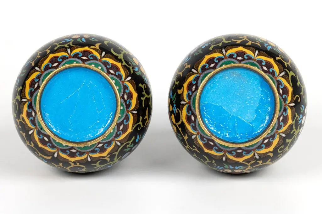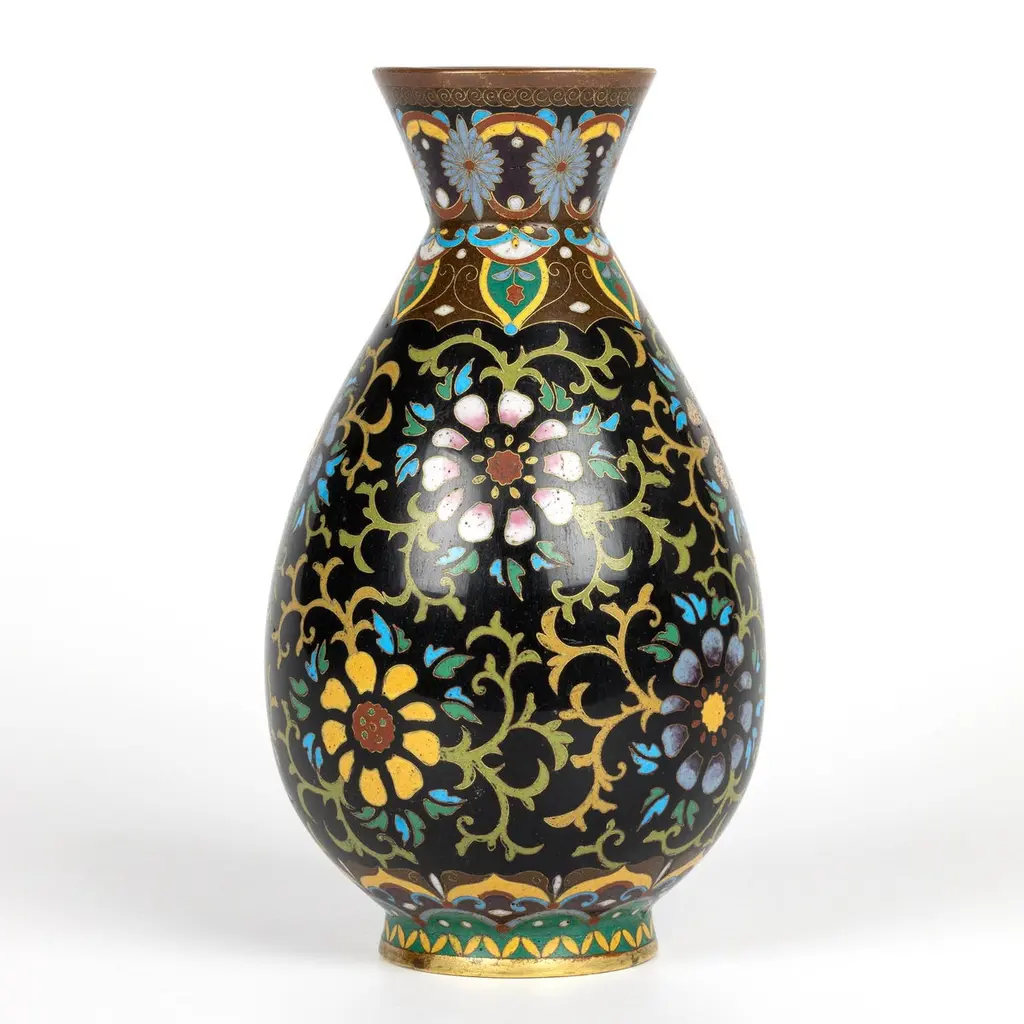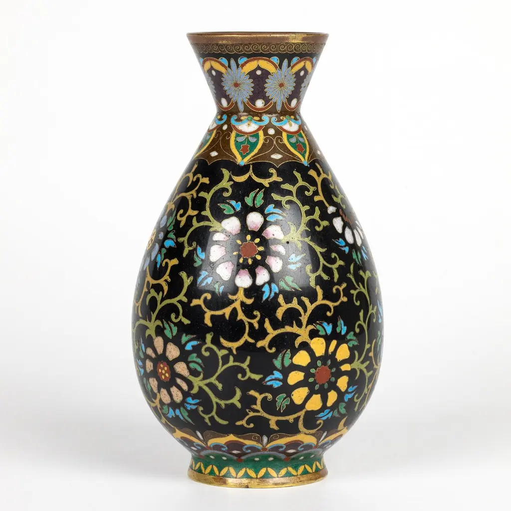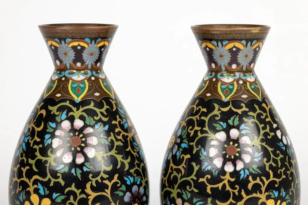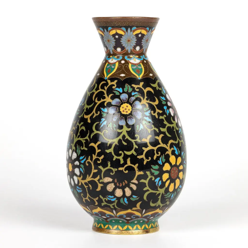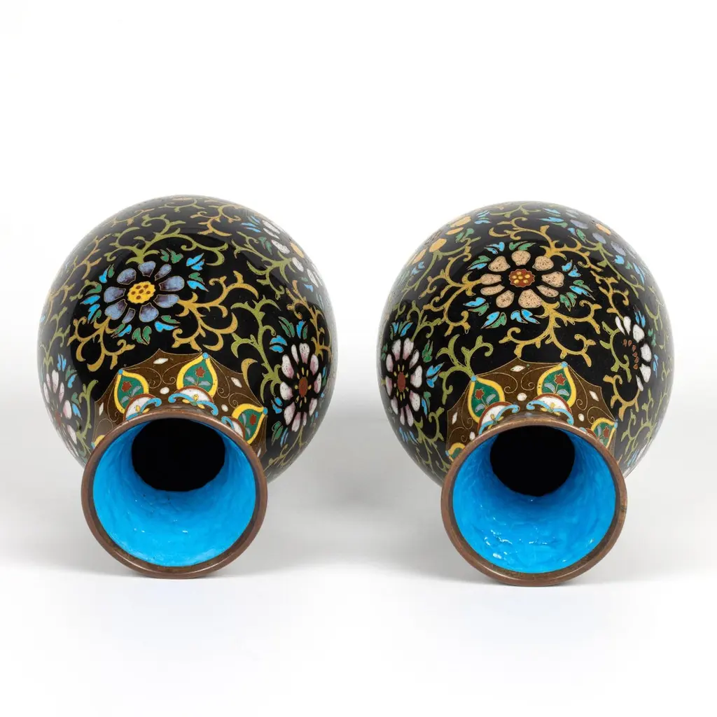 An exceptional and stunning pair antique Chinese Qing cloisonné enamel vases decorated with floral patterning dating from the late 19th or early 20th century. The bulbous bottle shaped vases stand raised on a narrow conical shaped foot with tear drop shaped bodies with a pinched neck and trumpet shaped top. The vases are decorated with repeat floral designs in various colored enamels with trailing leaf designs set against a black enamel ground. Decorative borders are applied around the upper and lower body. With brass rims to the top and base the vases are both decorated internally and to the bases with the customary turquoise enamel finish. The vases are not marked.Offered in good condition with usual signs of wear associated to age and use.Provenance: Acquired from the UK Art Market