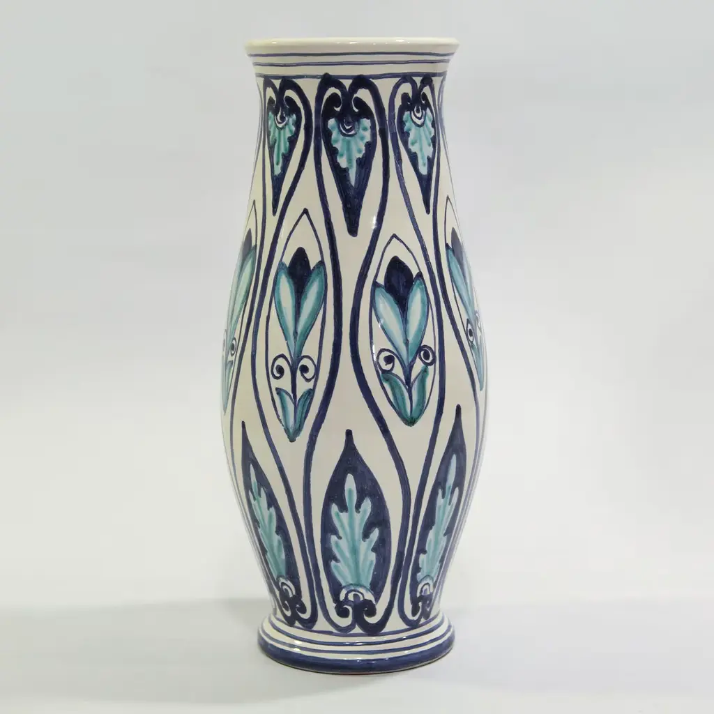 A superb Decò inspired objet d'art, this exquisite vase by Lorenza Adami for Sbigoli Terracotte is a tribute to her famous grandfather's early 20th-century ceramic designs. Showcasing a sinuous and gracefully curved silhouette, with a stunning antique floral pattern in vibrant hues of blue and turquoise, this unique piece is entirely handcrafted, glazed, and painted in the traditional Florentine majolica technique. A remarkable piece for traditional or contemporary spaces, this vase is customizable in different color tones, please contact the Concierge for further information.