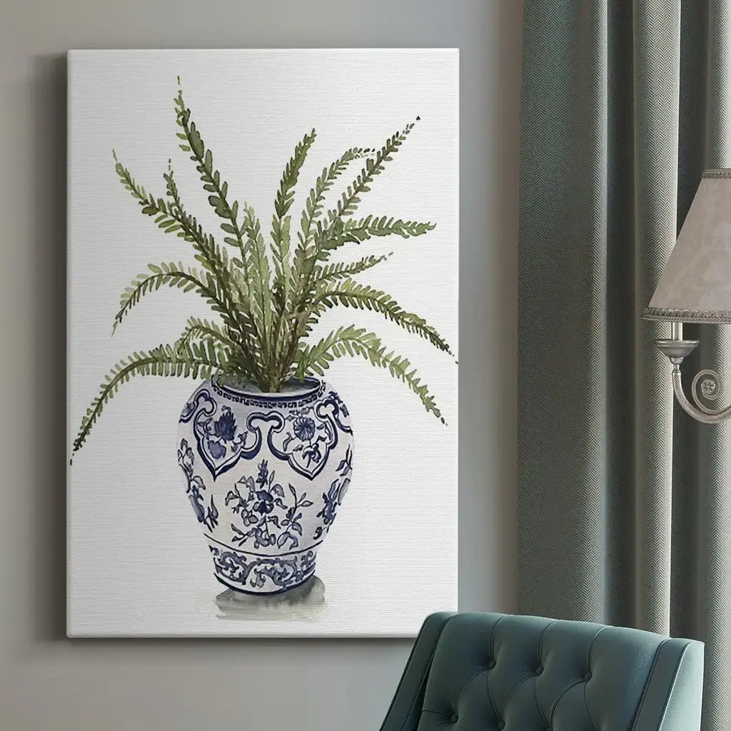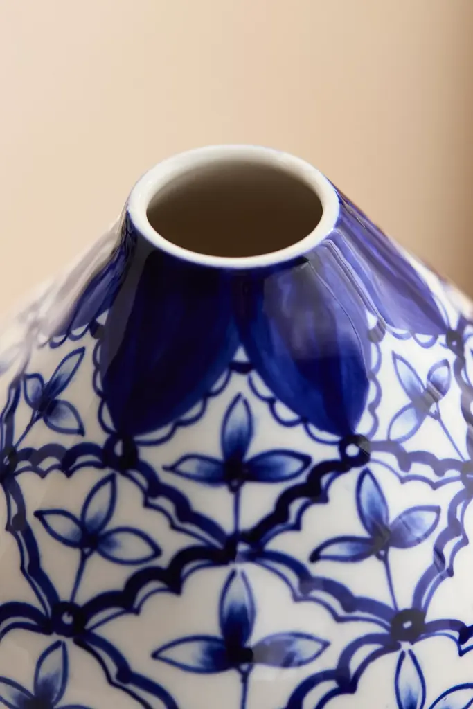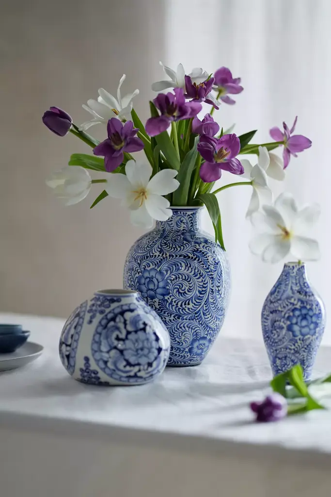 An updated version of traditional Chinese vessels, these curved vases feature lush blue floral patterns that will add depth to any setting.