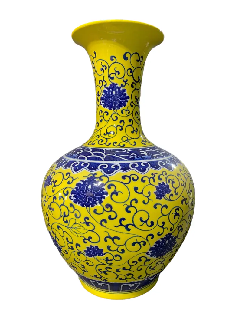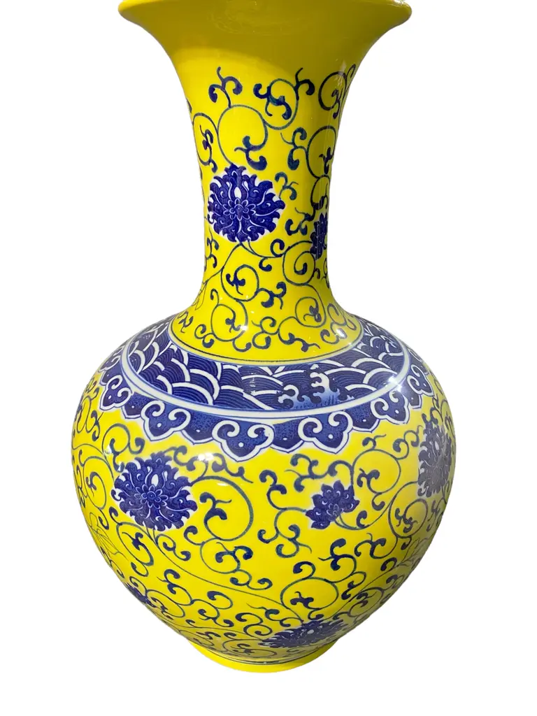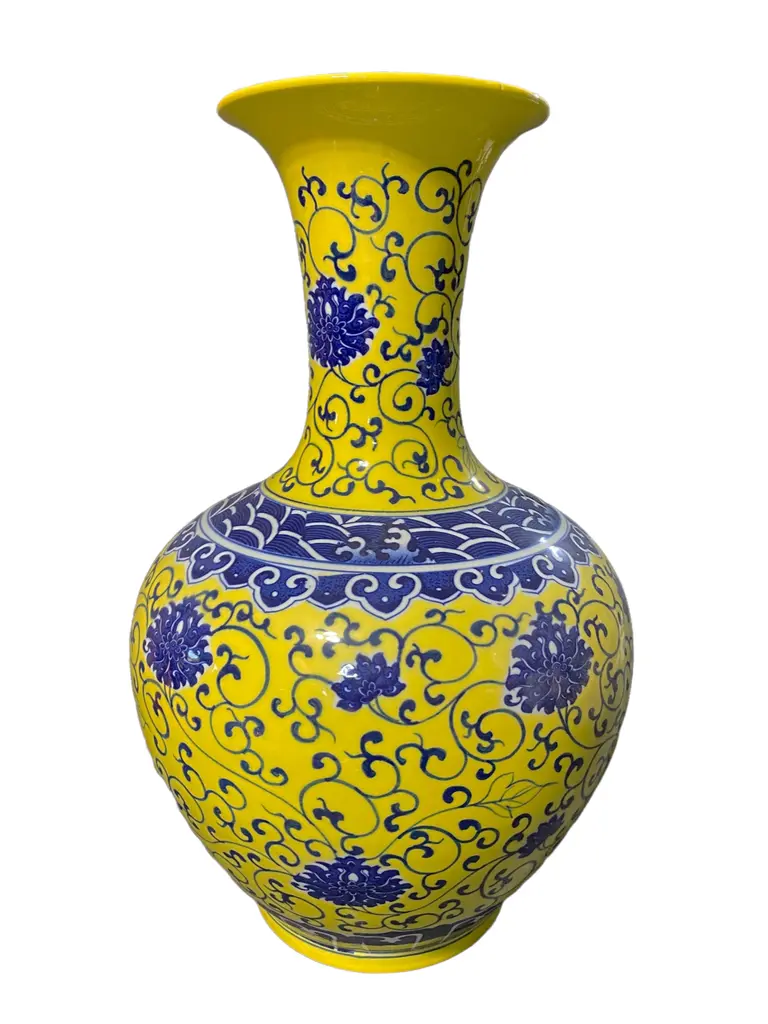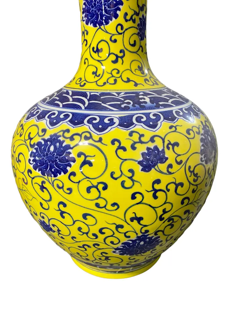 Vibrant and elegant Yellow and cobalt blue Chinese Famille Jaune Porcelain Onion Shape vase decorated with peonies The peony is a symbol of wealth and prosperity and is considered one of the most beautiful flowers in China 17.75" H by 11" diameter signed on the bottom