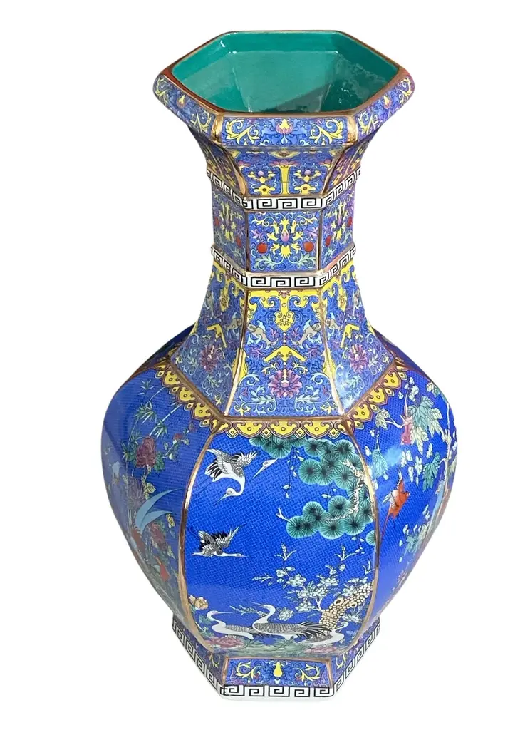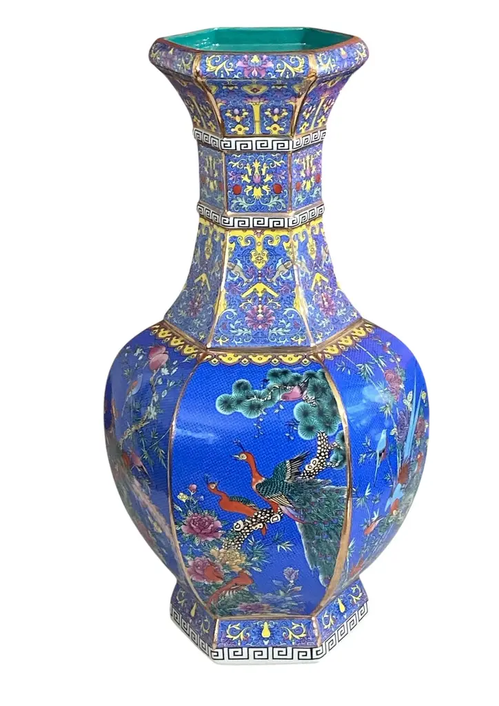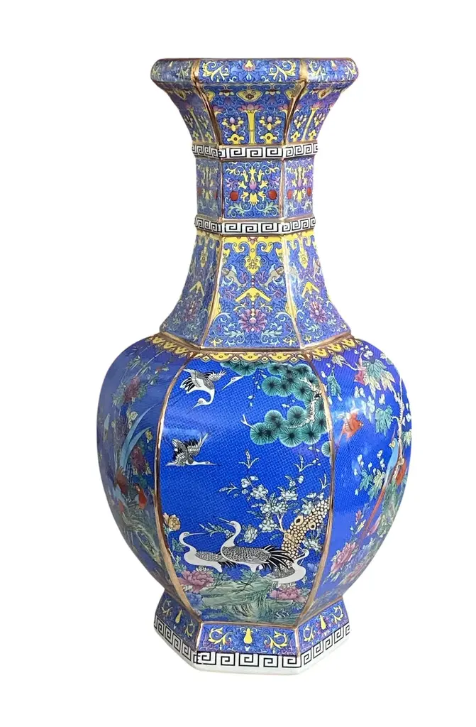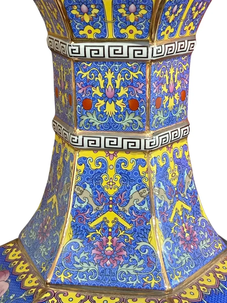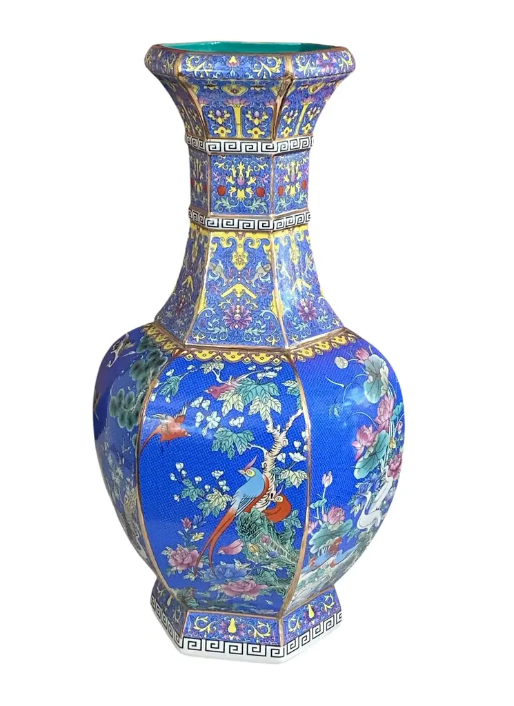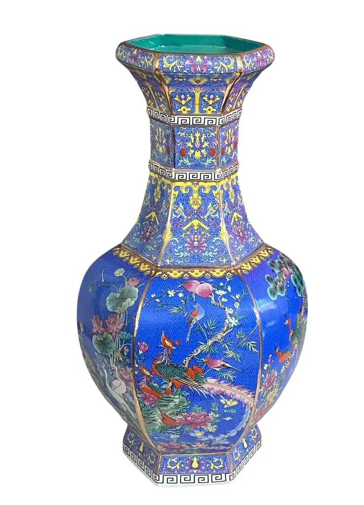 Chinoiserie Famille Rose Style Hexagonal Shaped Vase 20.5" H