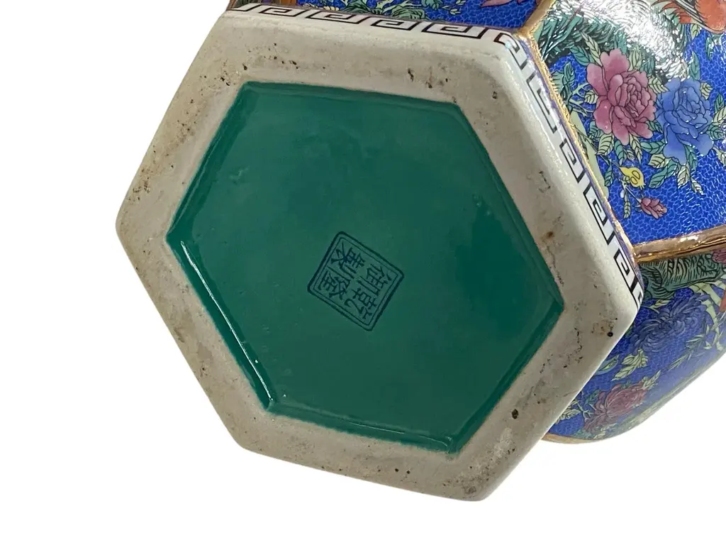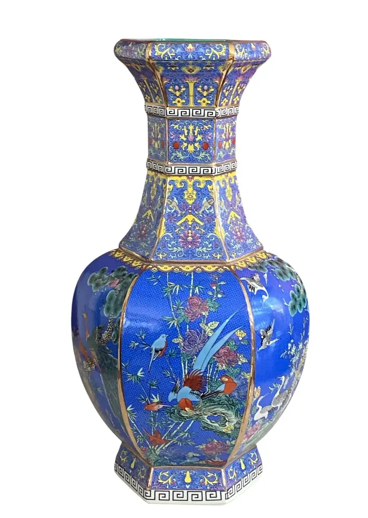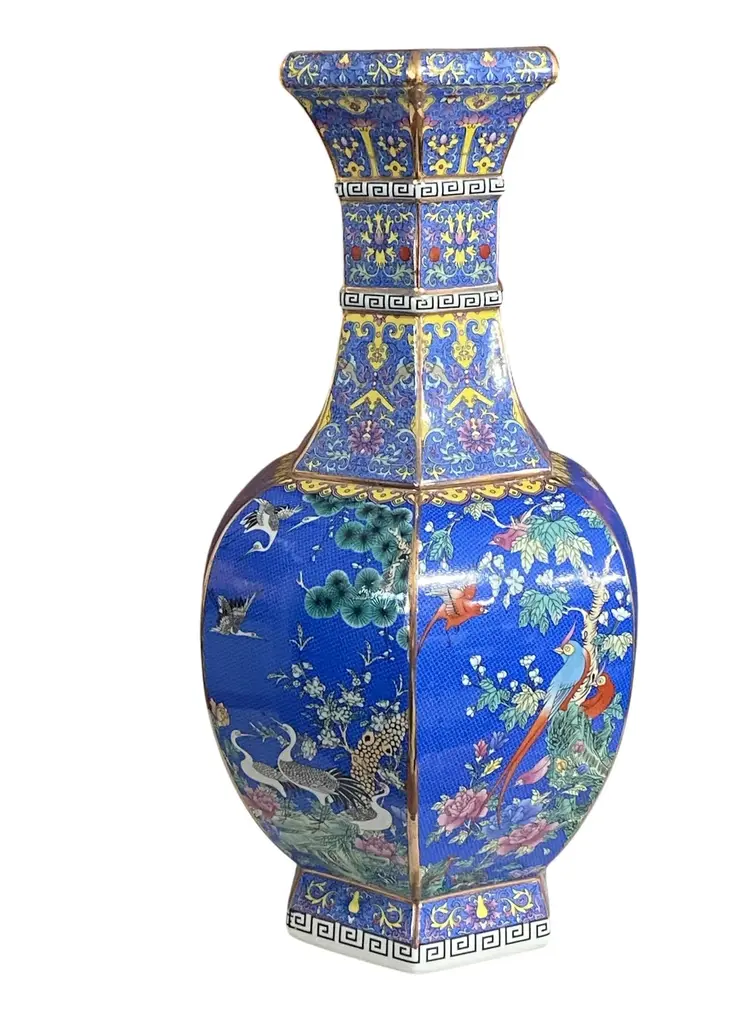 This vintage Famille Rose style porcelain vase features a distinctive hexagonal shape and is adorned with panels depicting serene garden scenes, including birds, waterfowl, and multicolored flowers set against a blue background. The piece is signed and measures 20.5 inches in height with a 10-inch diameter.