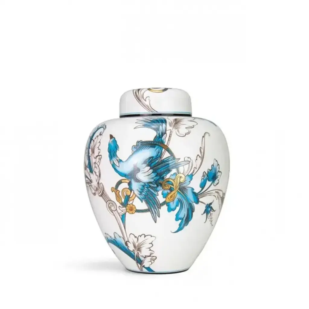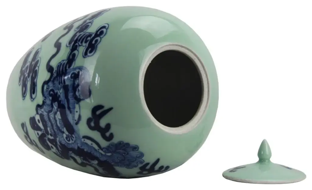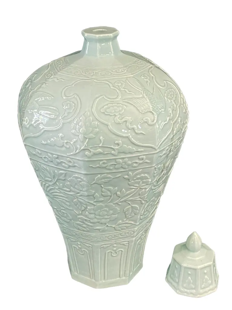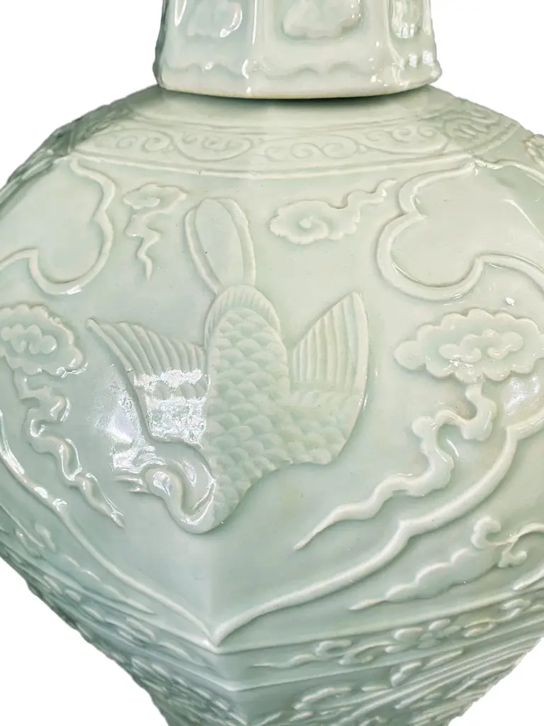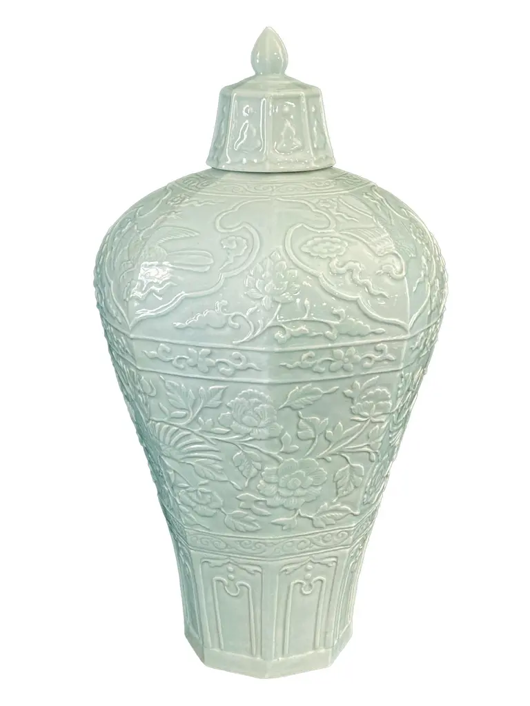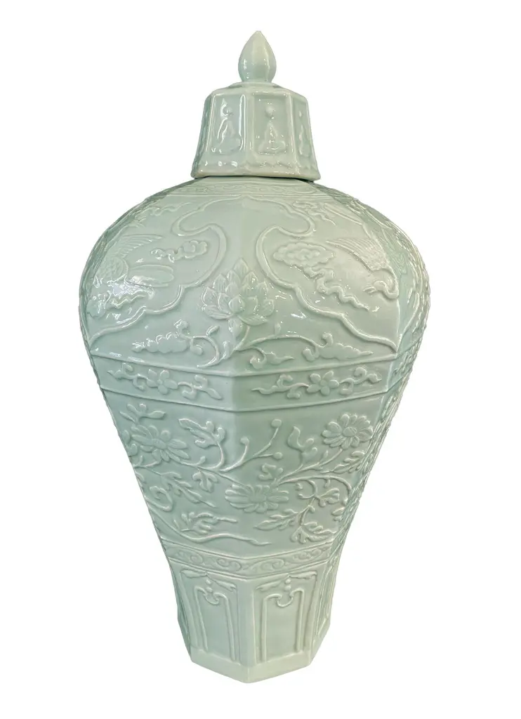 Chinoiserie Octagonal Celadon Lidded Vase.
