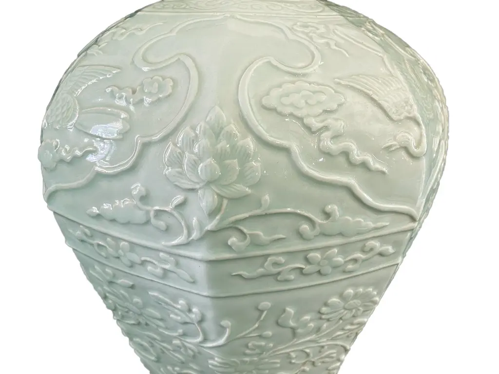 Superb and elegantly shaped Chinoiserie Octagonal Celadon Lidded Vase depicting in high relief flying cranes ,Chrysanthemum flowers etc...base with small medallions.... The crane has been one of the most loved birds in China since ancient times. It is seen as a symbol of noble character and represents longevity. More romantically, the crane represents long-lasting love and loyalty in marriage, as the bird is monogamous and stays with one partner until death.21" H by 12" diameter .