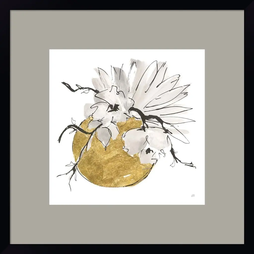 Delicate Gilded Vase I by Chris Paschke is a high quality piece of framed artwork. The finished size of this piece is 19" X 19". It has a Petite Black with Flat Front frame, is single matted and finished with high quality Acrylic Plexiglass. 100% Satisfaction Guaranteed.