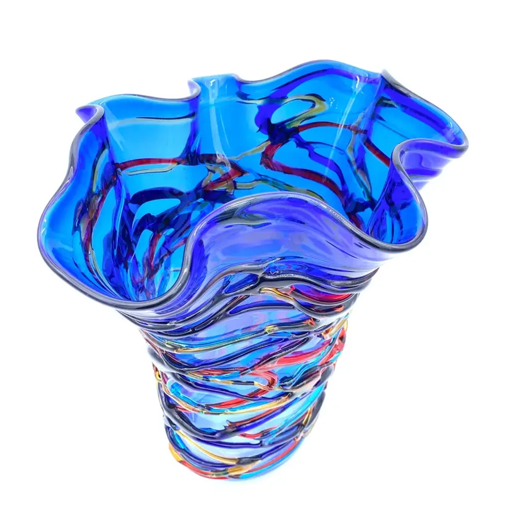 Explore the artistry of this contemporary Murano glass vase, CHROMA FLY BLUE. Its unique fluted design and vibrant color palette capture the essence of Venetian craftsmanship. Handcrafted in Murano, it's an exceptional work of art. Perfect for decor or a meaningful gift. Incandescent filaments of blue, green, and amber glass envelop this line of hand-blown glass vases, giving life to glass artworks that leave you in awe at first sight. The unique shape of these decorative vases, made in Italy, is sinuous and almost fluid. These exceptional handcrafted vases were forged in the renowned workshops of Murano, thanks to a powerful blend of passion, talent, and unparalleled skills rooted in decades of glassmaking experience. All our products are artisanal and of the highest production quality. Non-substantial variations in shape, size, color, and/or minor imperfections are inevitable and are typical of manual glasswork, highlighting the artisanal craftsmanship.
