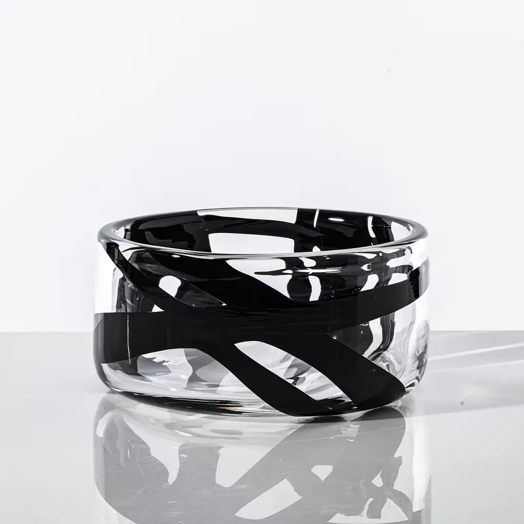 Crafted by Peter Marino, the new Cilindro Collection, hand-blown in crystal-clear glass, bear a strikingly distinctive feature: submerged black bands that emphasize their form and dramatic presence. These vases carve out a bold, unique statement, showcasing meticulous craftsmanship and an impactful aesthetic through their defining black accents.