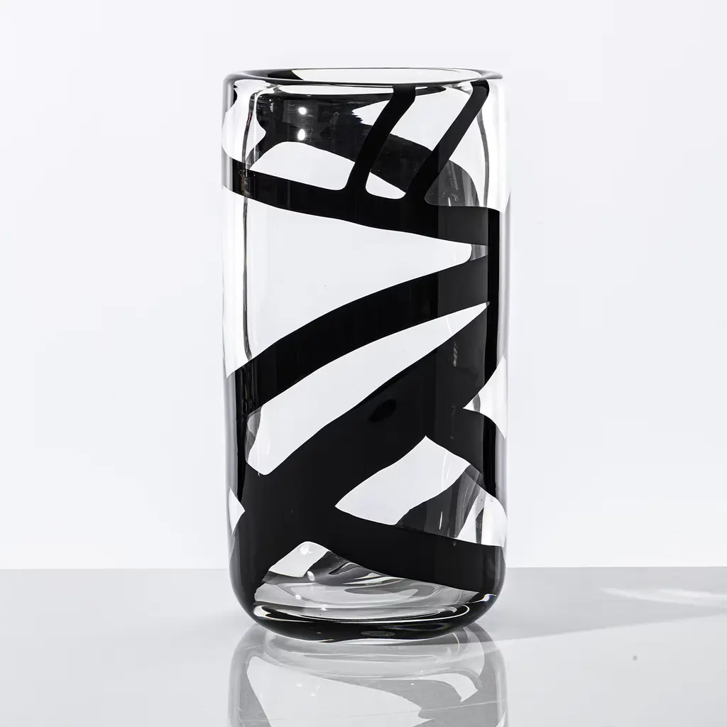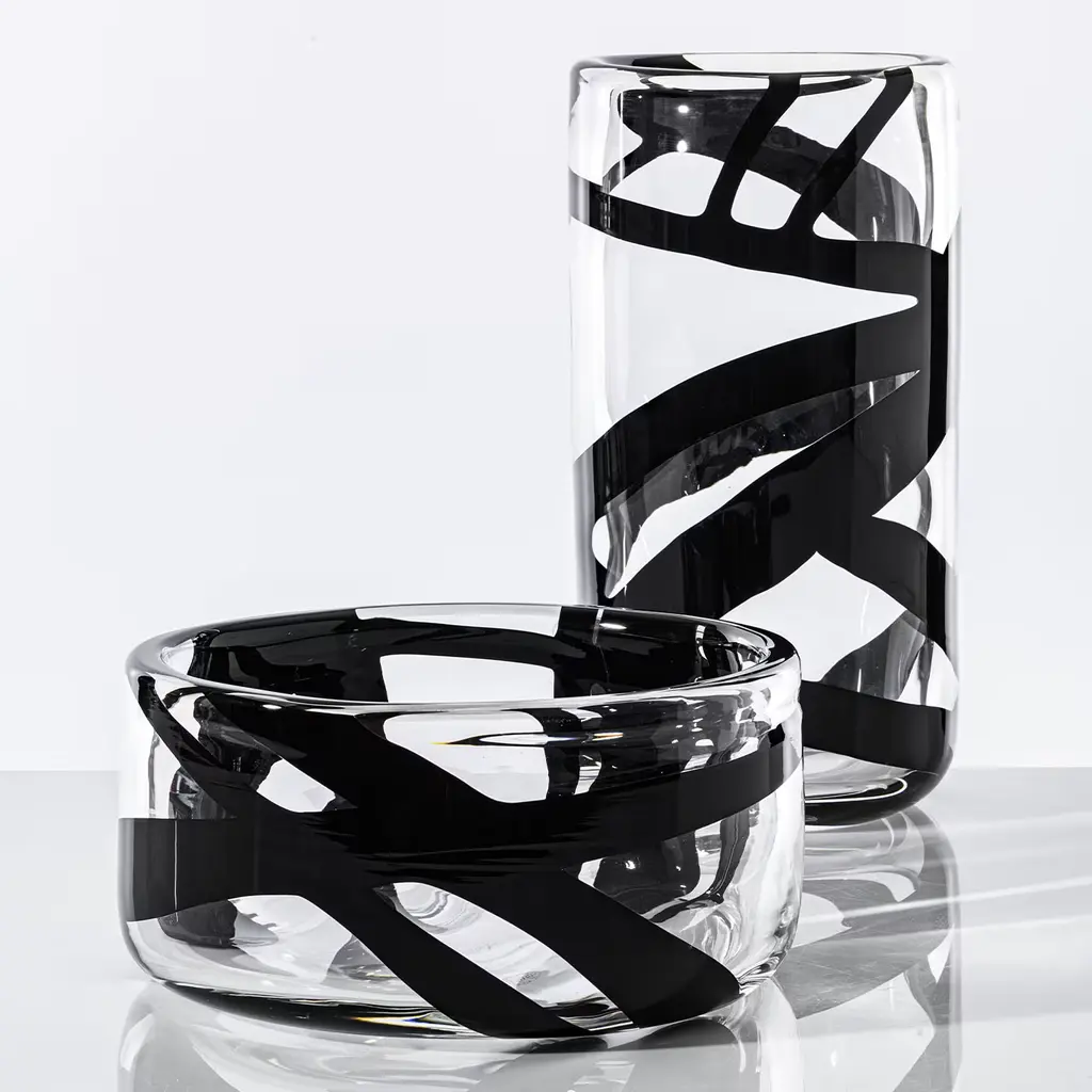 Crafted by Peter Marino, the new Cilindro Collection, hand-blown in crystal-clear glass, bear a strikingly distinctive feature: submerged black bands that emphasize their form and dramatic presence. These vases carve out a bold, unique statement, showcasing meticulous craftsmanship and an impactful aesthetic through their defining black accents.