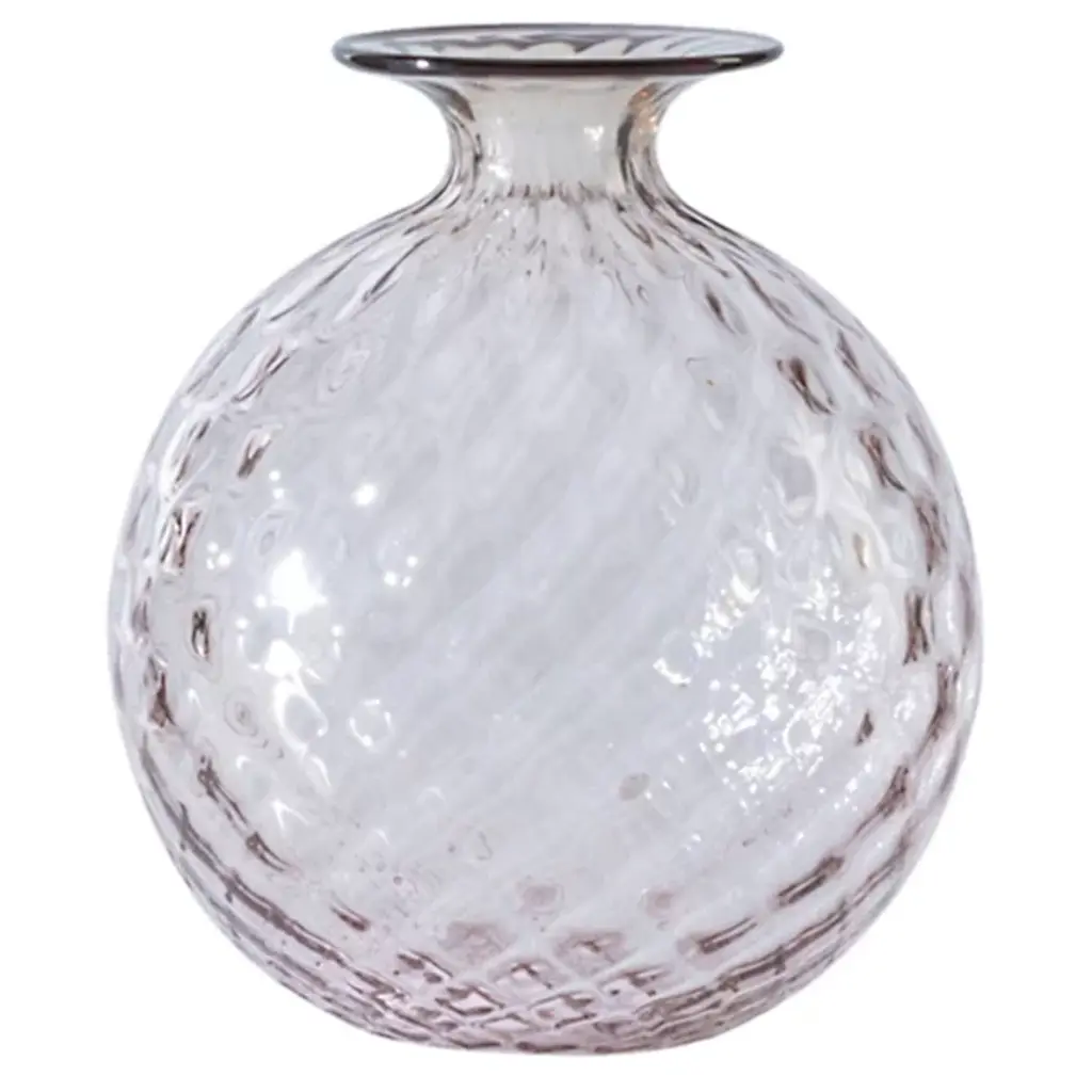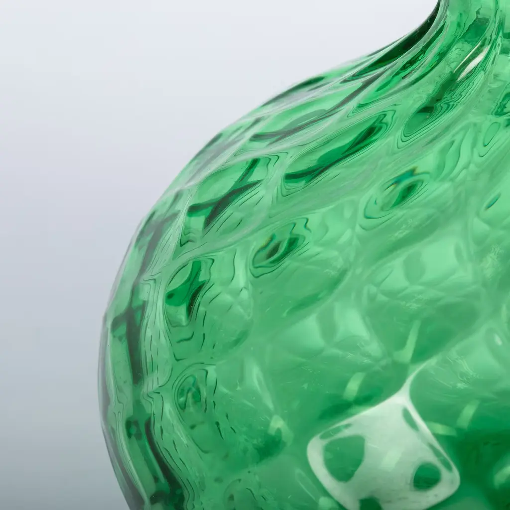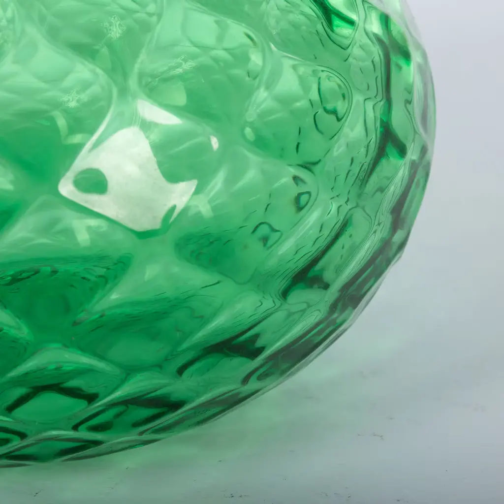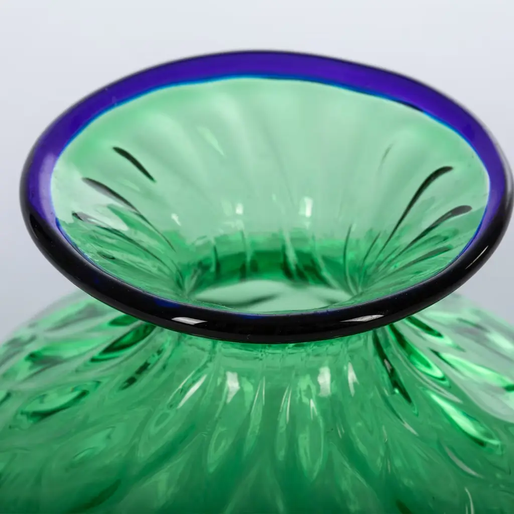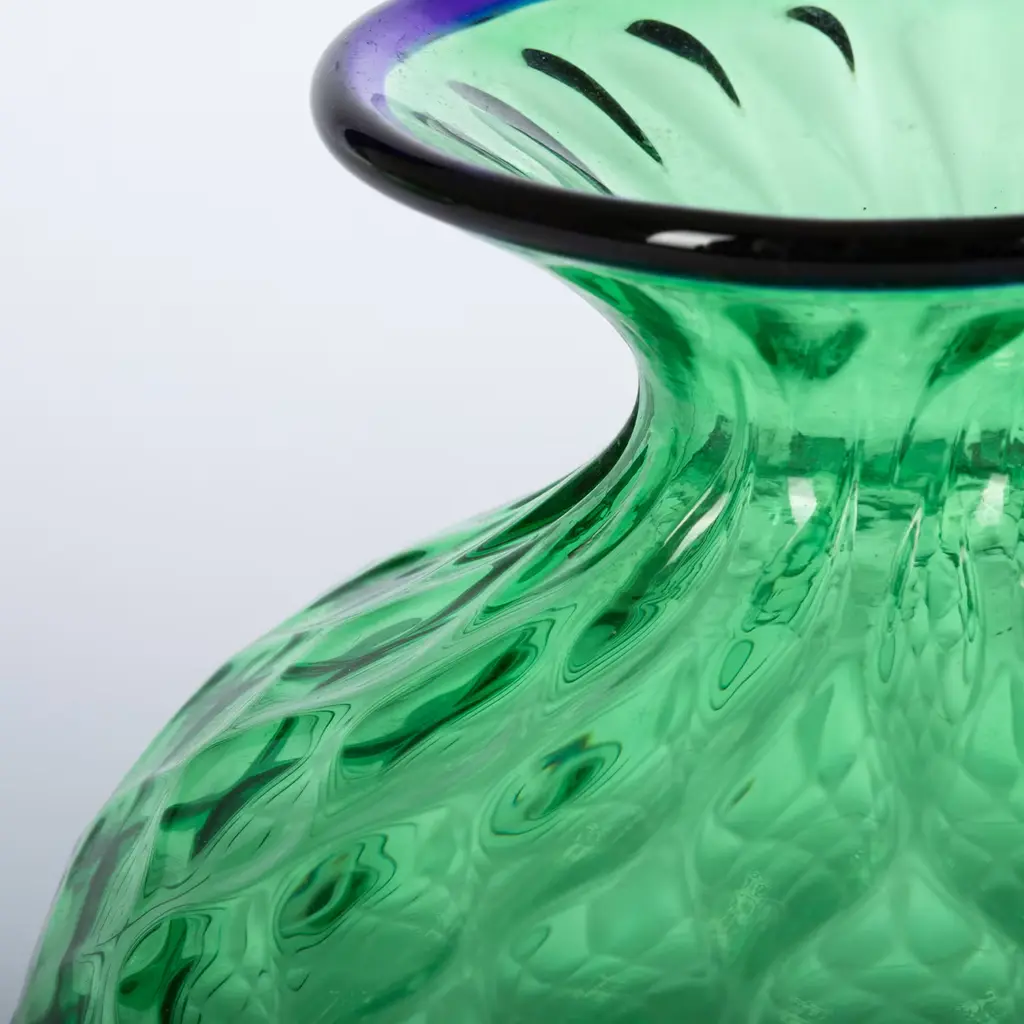 Playfully reminiscent of an onion, the harmonious silhouette of this vase in prized, green-hued Murano glass is the result of a deft mouth-blowing process carried out by master artisans following century-old methods. Enlivened by a blue rim for a stylish chromatic twist, the vase stands out for its extensive diamond texture obtained with the traditional balloton technique.