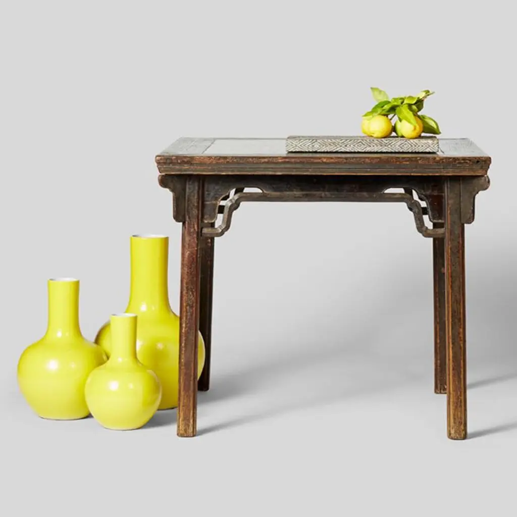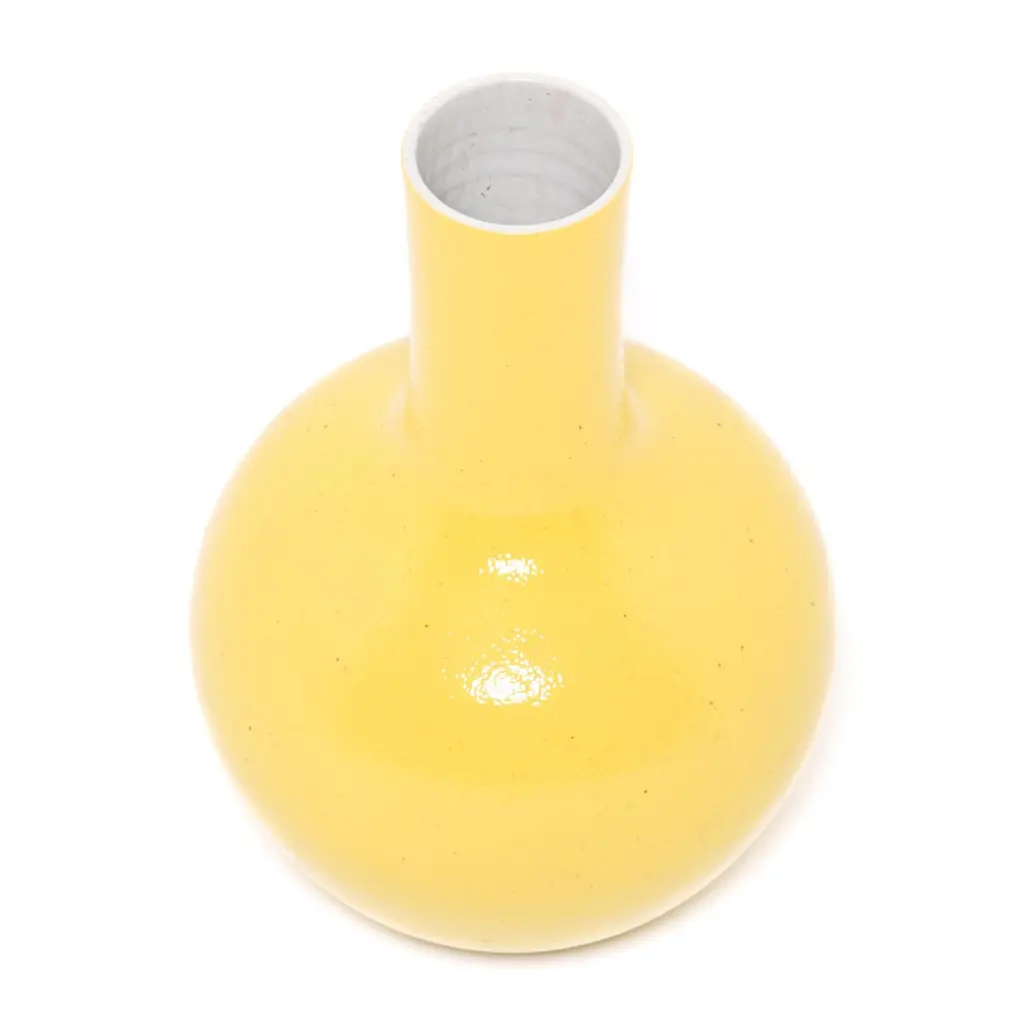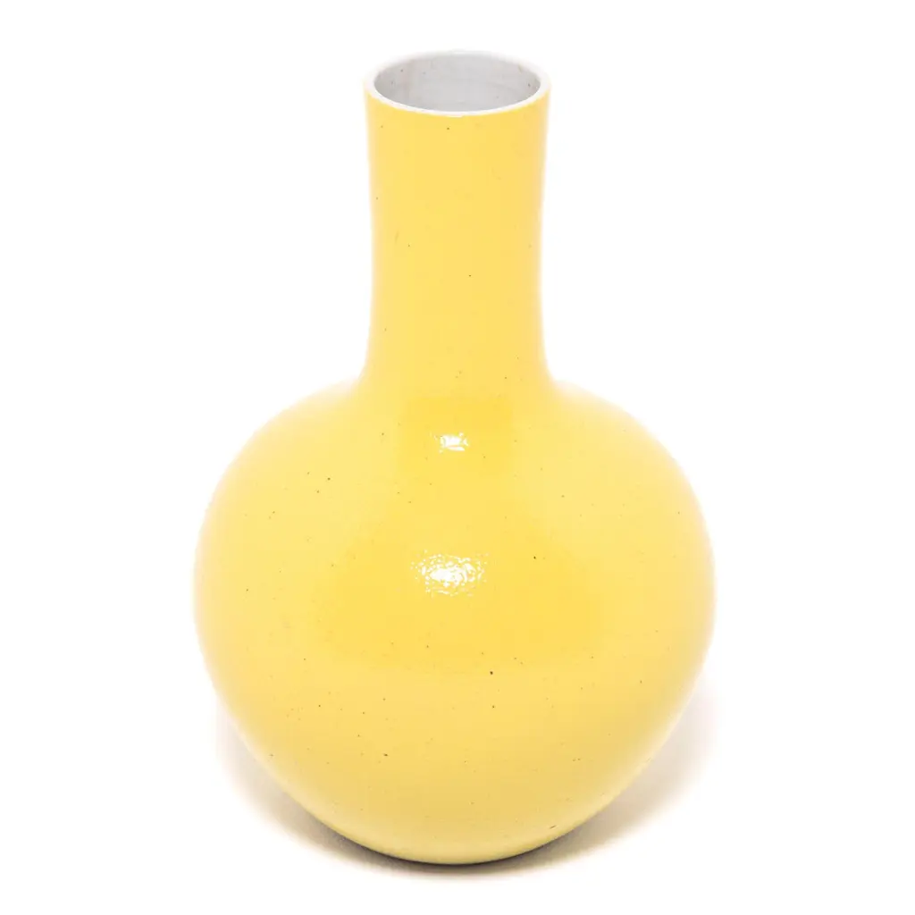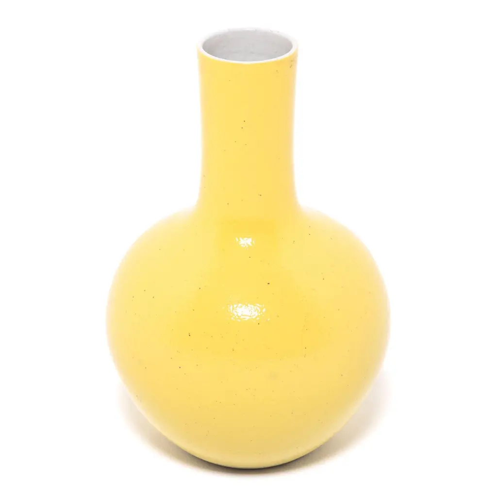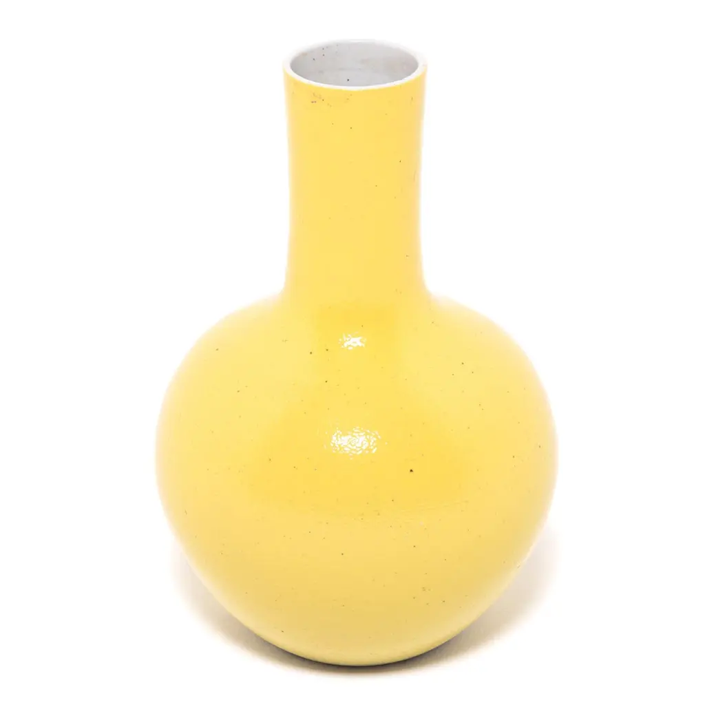 Drawing on a long Chinese tradition of ceramics, this striking long-necked vase is cloaked in an all-over citron-yellow glaze. With a rounded, globular body and cylindrical neck, the large vase reinterprets the traditional gooseneck shape known as a "celestial ball vase" with clean lines and an understated sculptural presence. The striking yellow glaze nods to the Song dynasty (960–1279), when tastes shifted to monochrome glazes in single, statement-making colors.Each jar is hand-made. Dimensions vary slightly.