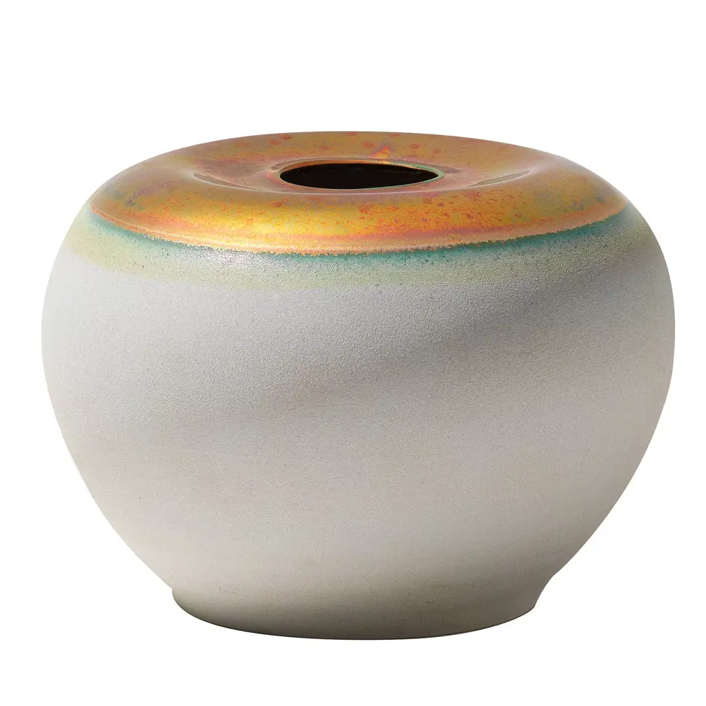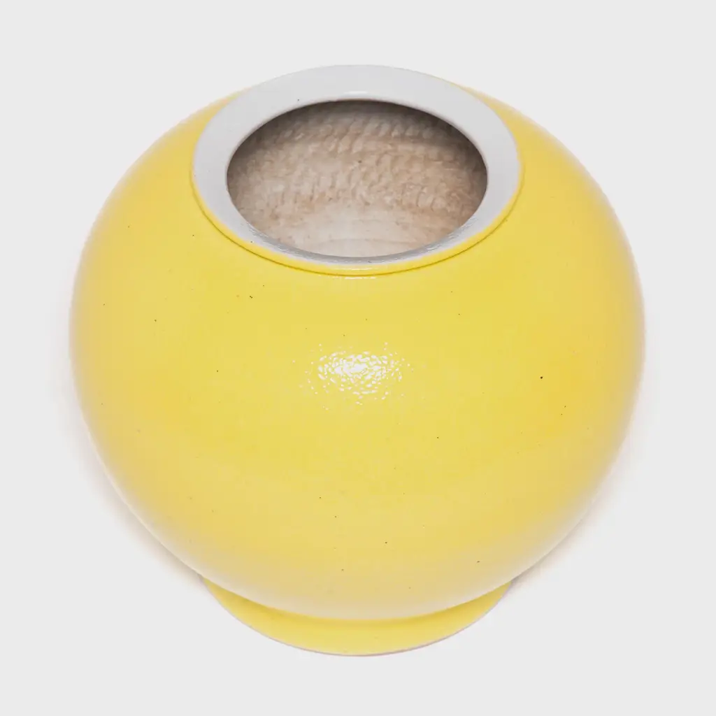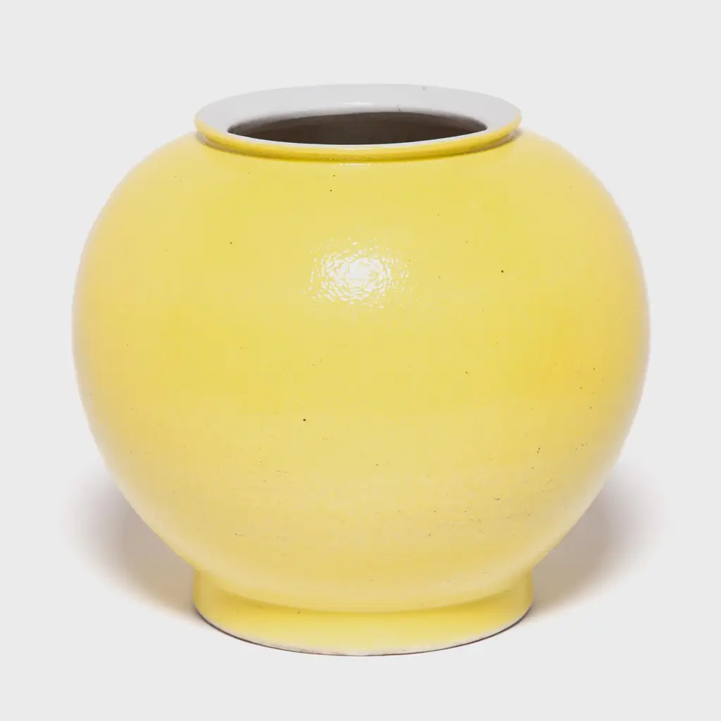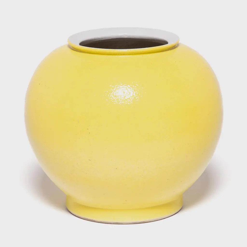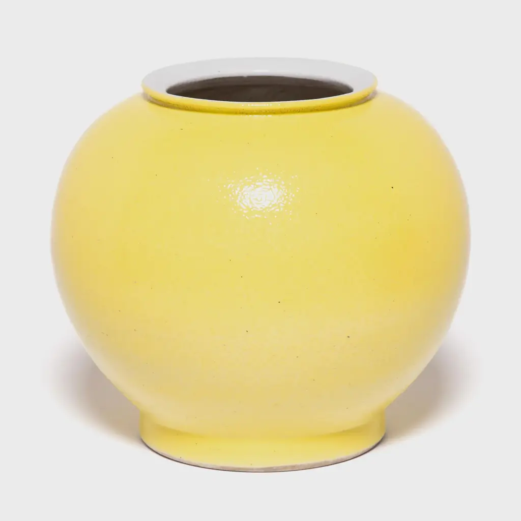The striking bright yellow of this vase draws on a long Chinese tradition of glazing sculptural forms with a single, statement-making color. This contemporary take cloaks the round curves of the onion vase form in a glossy, citron yellow. Considered the most beautiful and prestigious color, the yellow glaze symbolizes good fortune and lends a cheerful splash of color to any room.
